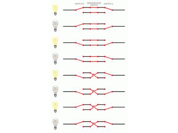 The typical example of this is on a landing in a house, when perhaps there is a switch at the bottom of the stairs, one at the top of the stairs and one at the end of the landing. On this circuit you would need the middle switch; the one at the top of the stairs, to be an intermediate switch. The other two light switches would need to be two way switches.