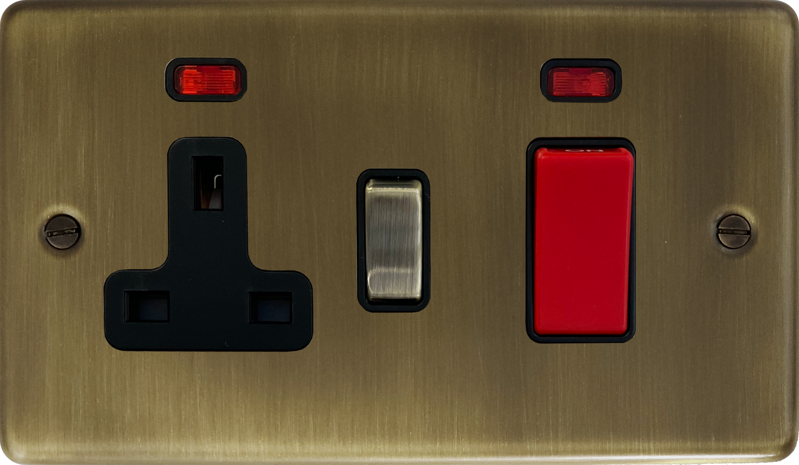 The cooker switch is a red 45 amp cooker switch. The socket is a 13 amp socket with an antique brass switch. It is fixed to an antique brass cooker switch plate. The switch plate is brass with an antique brass finish.