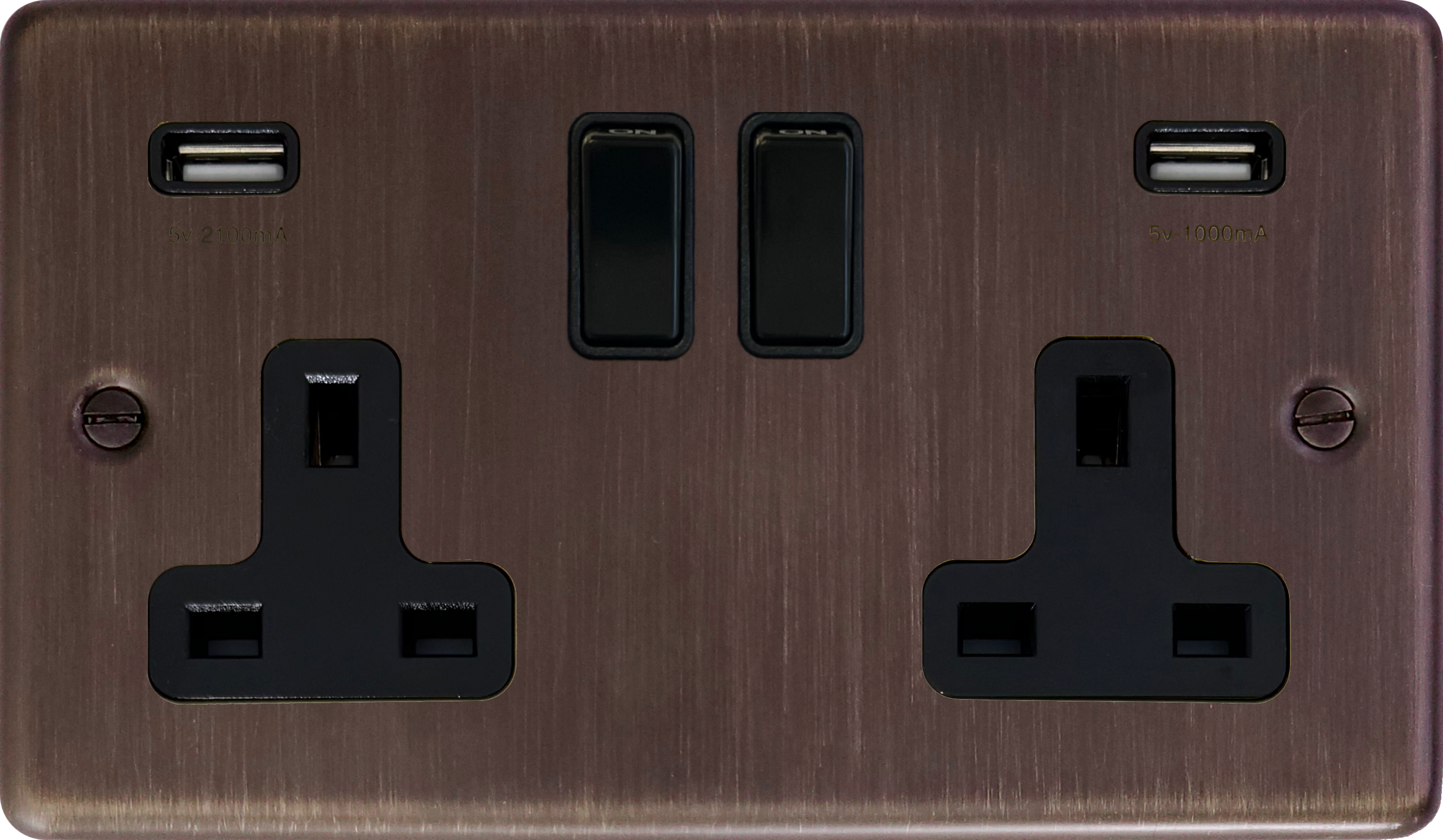Contour Antique Copper Double Socket with USB (Black Switch) - CAC910B