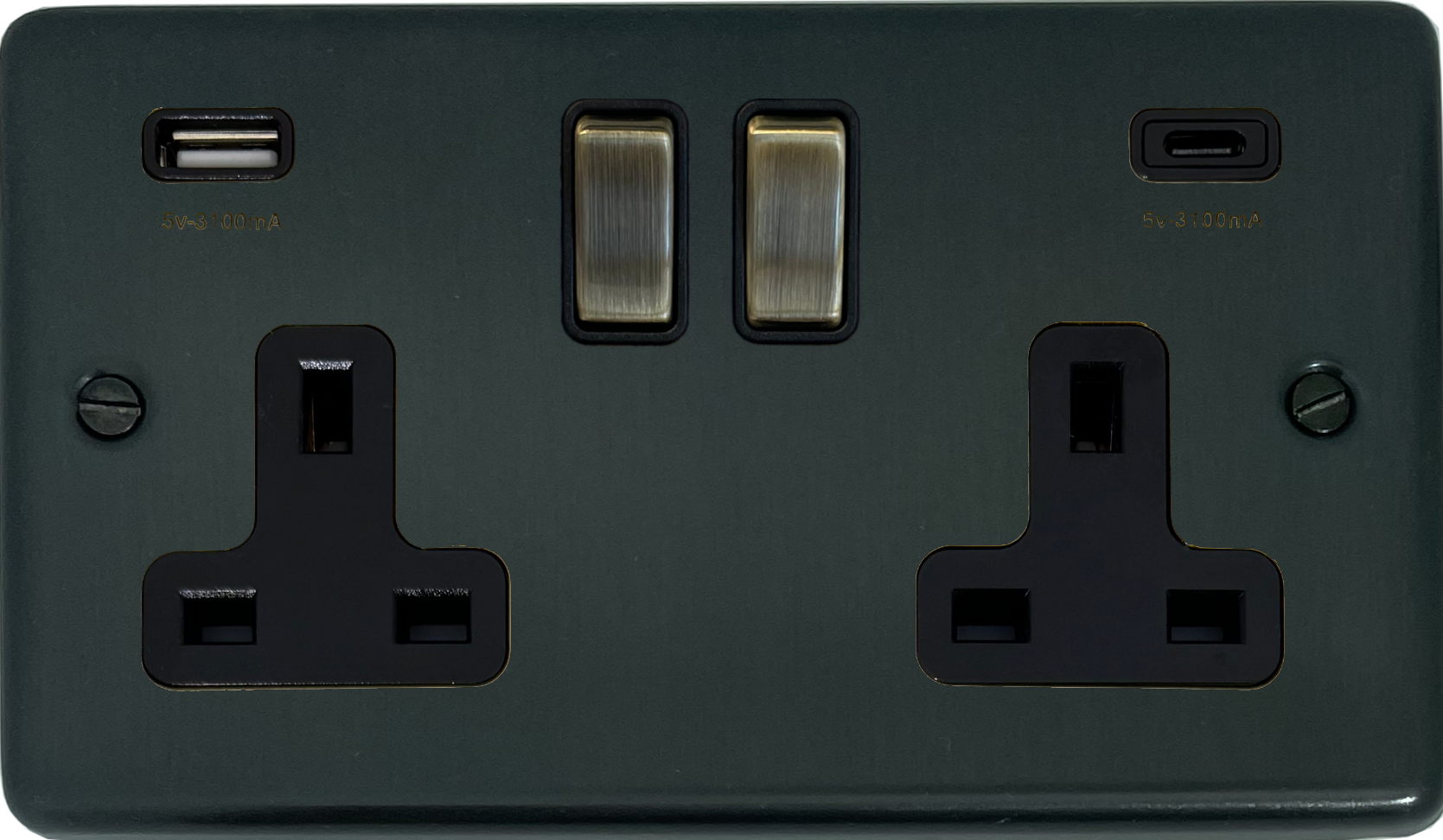 Contour Black Bronze Socket with USB (2 Gang/USB-A and USB-C/Antique Brass Switches) CL.3911AB.BB