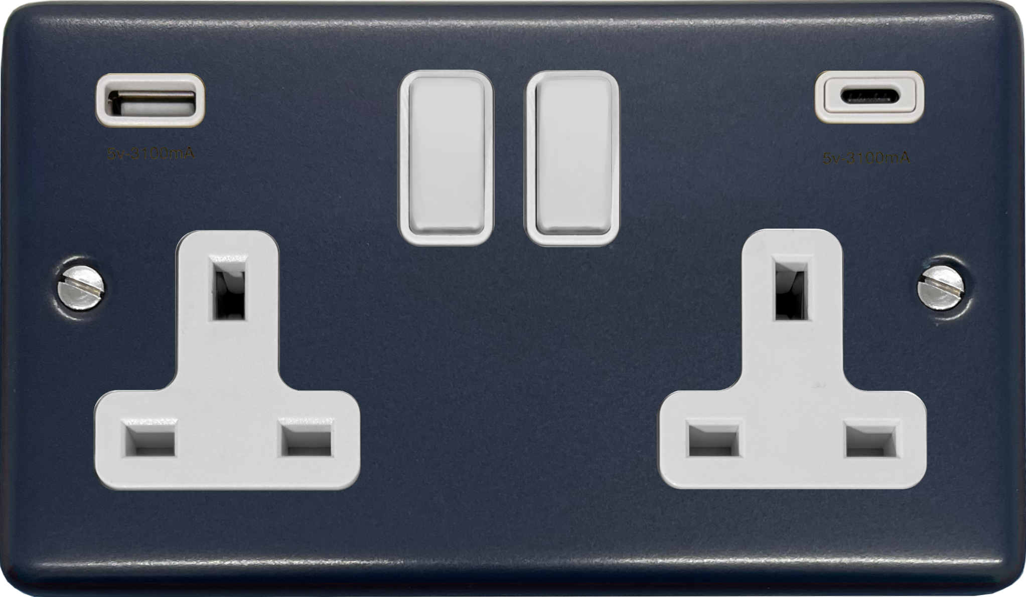 Contour Blue Double Socket with USB (USB-A and USB-C/White Switches) - CRB911W