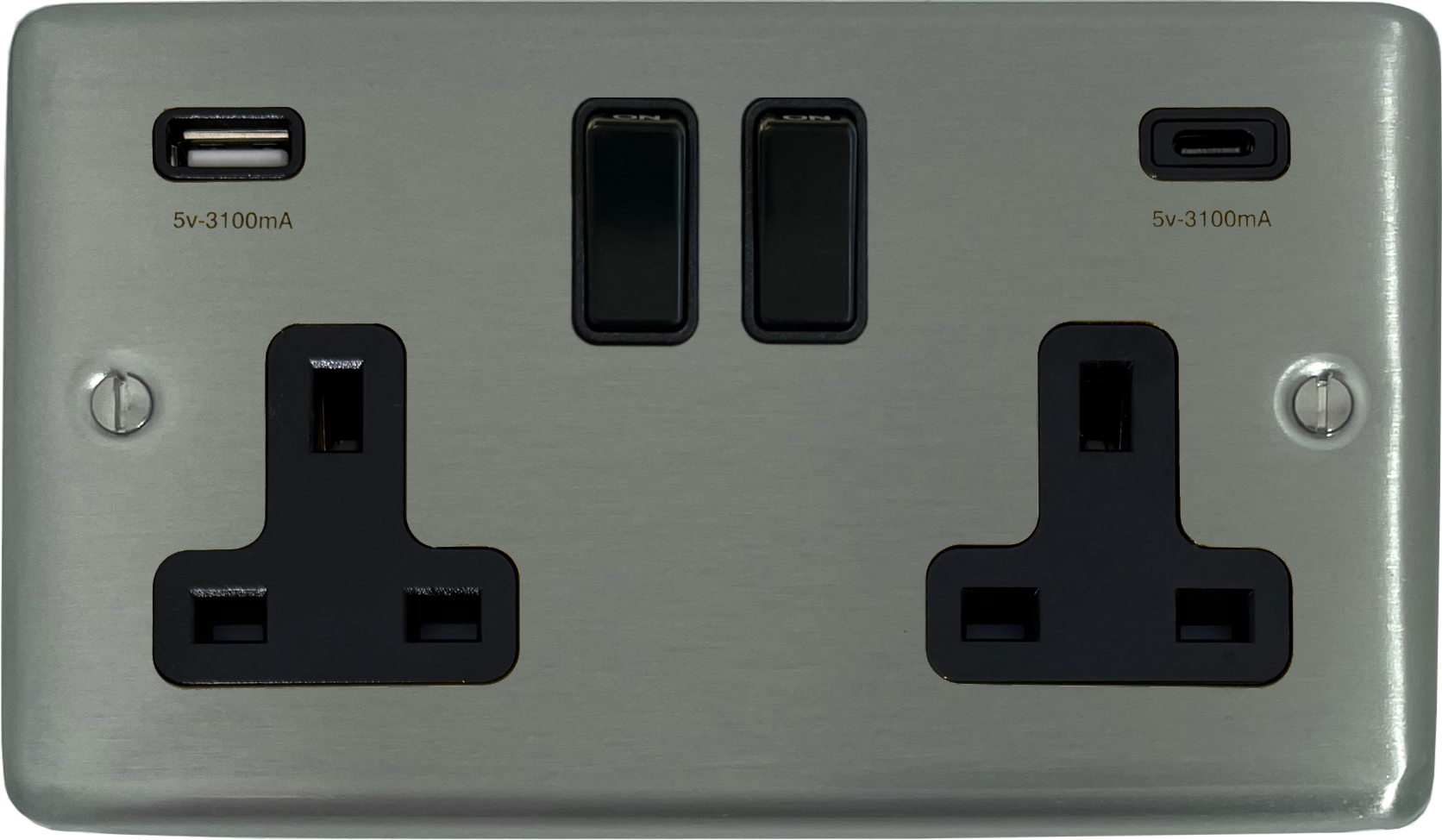 This is the Contour stainless steel double socket with USB. It is a two gang stainless steel socket with two USB charging points. They are: