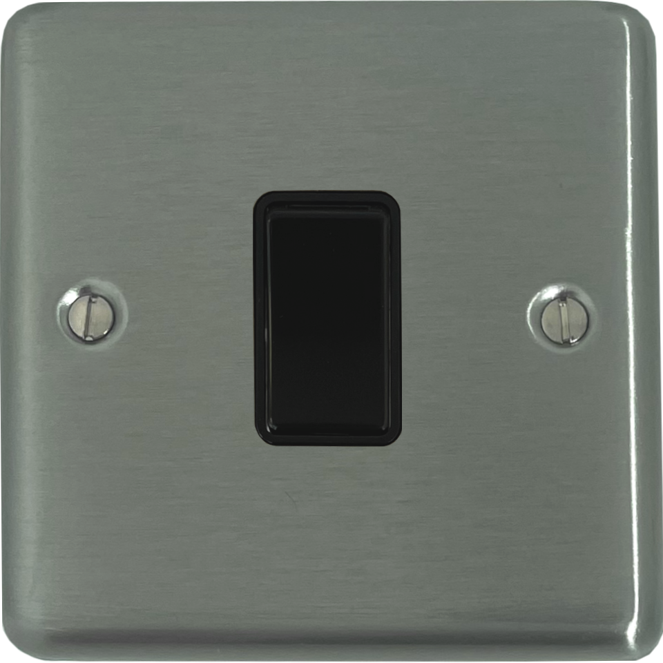 It is a two way black plastic rocker switch. The switch plate is stainless steel, finished in a brushed finish. It is a single plate, part of the complete range of Contour brushed steel sockets and switches by G+H Electrical Accessories.