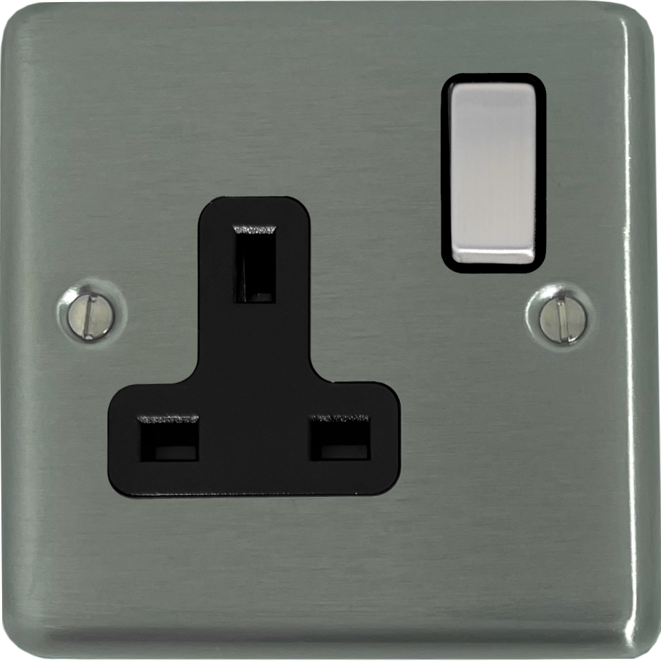 The switch is a satin chrome rocker switch with a black surround. The socket is a 13 amp socket with black plastic inserts. It is fixed to a stainless steel socket plate.