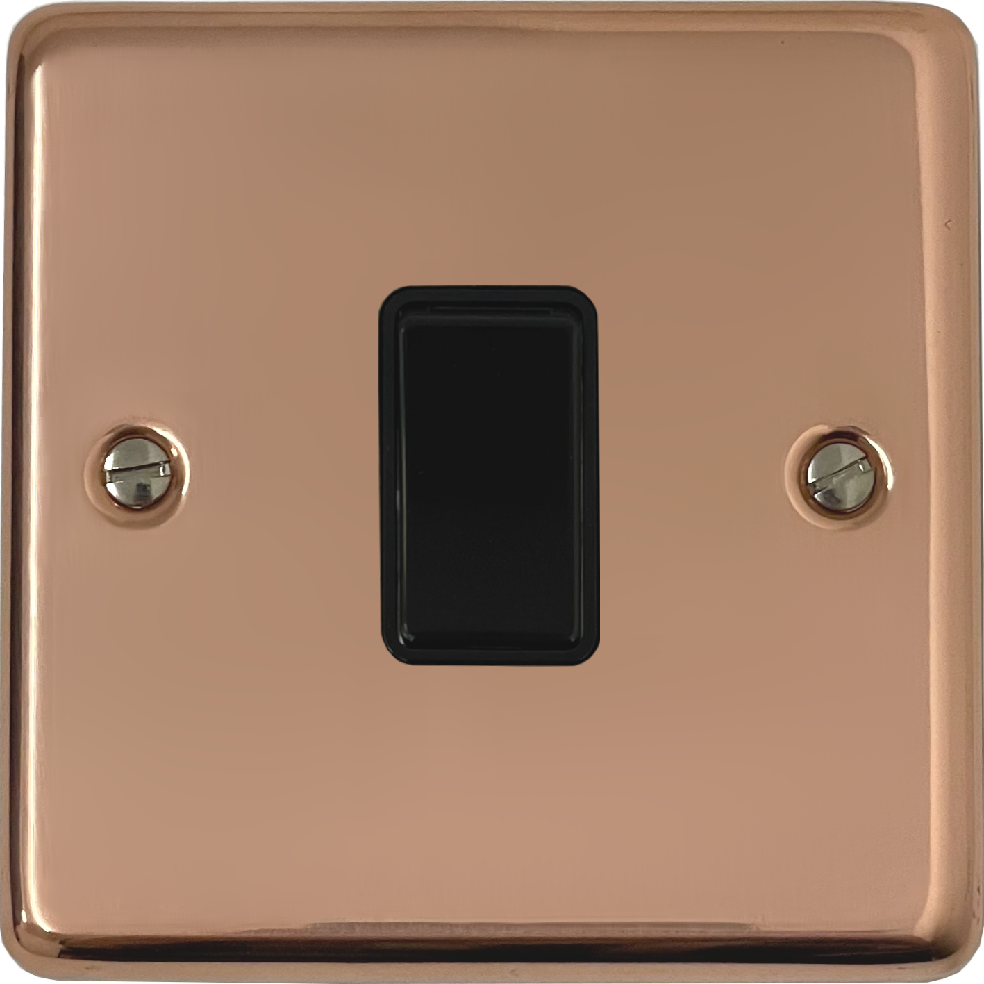 This is a one gang copper two way light switch with a black plastic switch. Made in the UK.