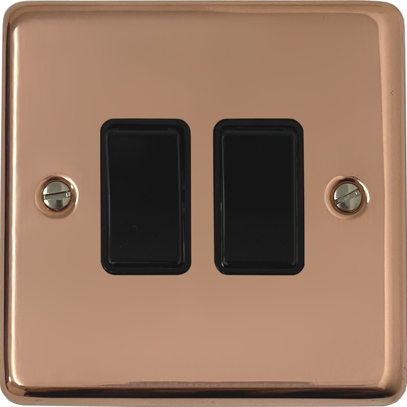 This is a two gang copper two way rocker light switch with black switches and black inserts. Made in the UK with 10 years' warranty.