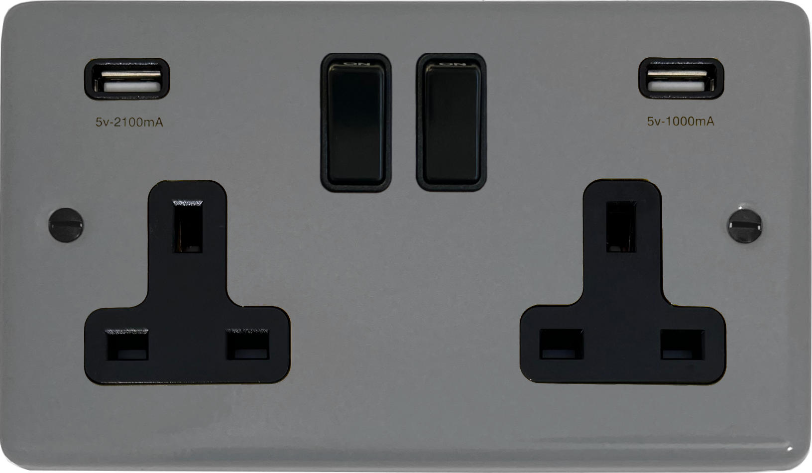 Contour Light Grey Double Socket with USB (Black Plastic Switches) - CLG910B