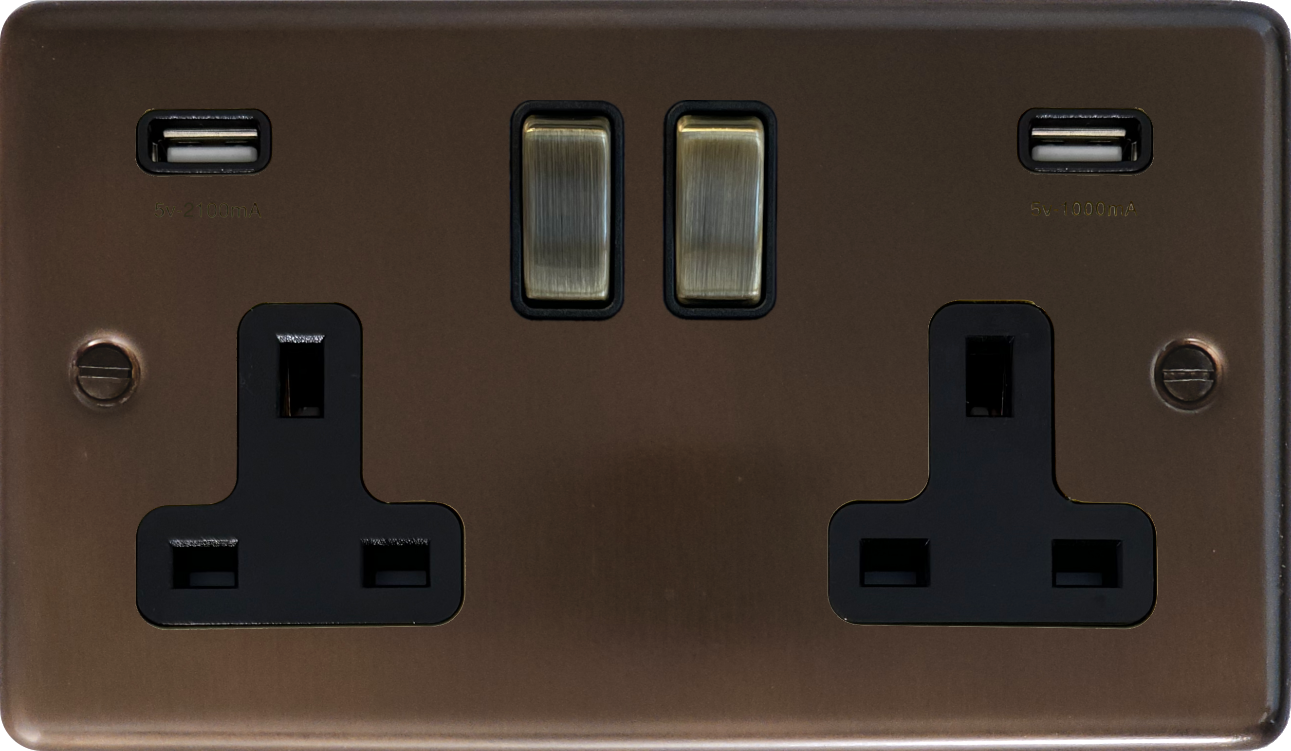 Contour Medium Bronze Double Socket with USB (Black Inserts/Antique Brass Switches) - CMBZ3910-AB