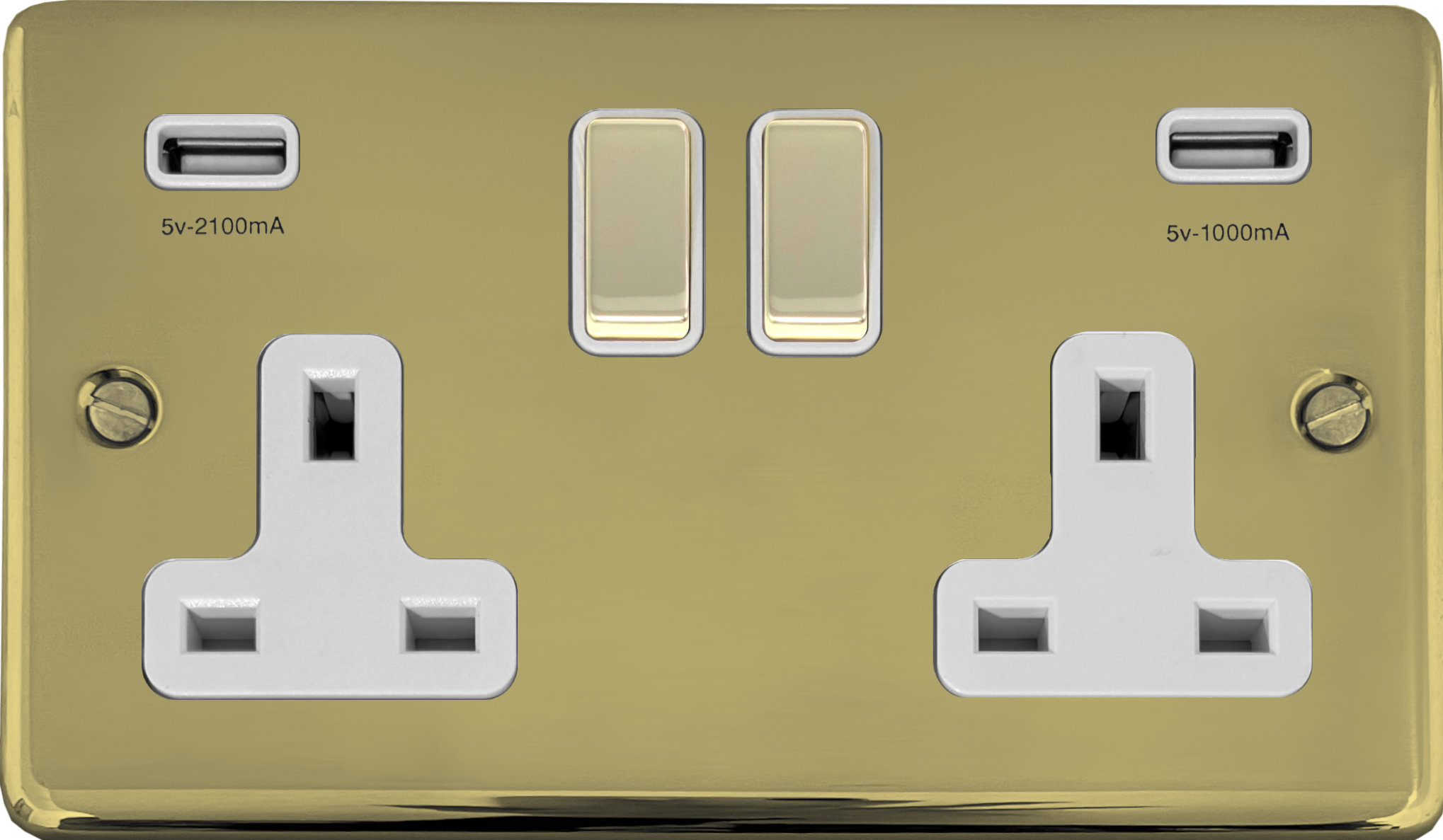 Contour Polished Brass Double Socket with USB (Brass Switches/White Inserts) - CB2910