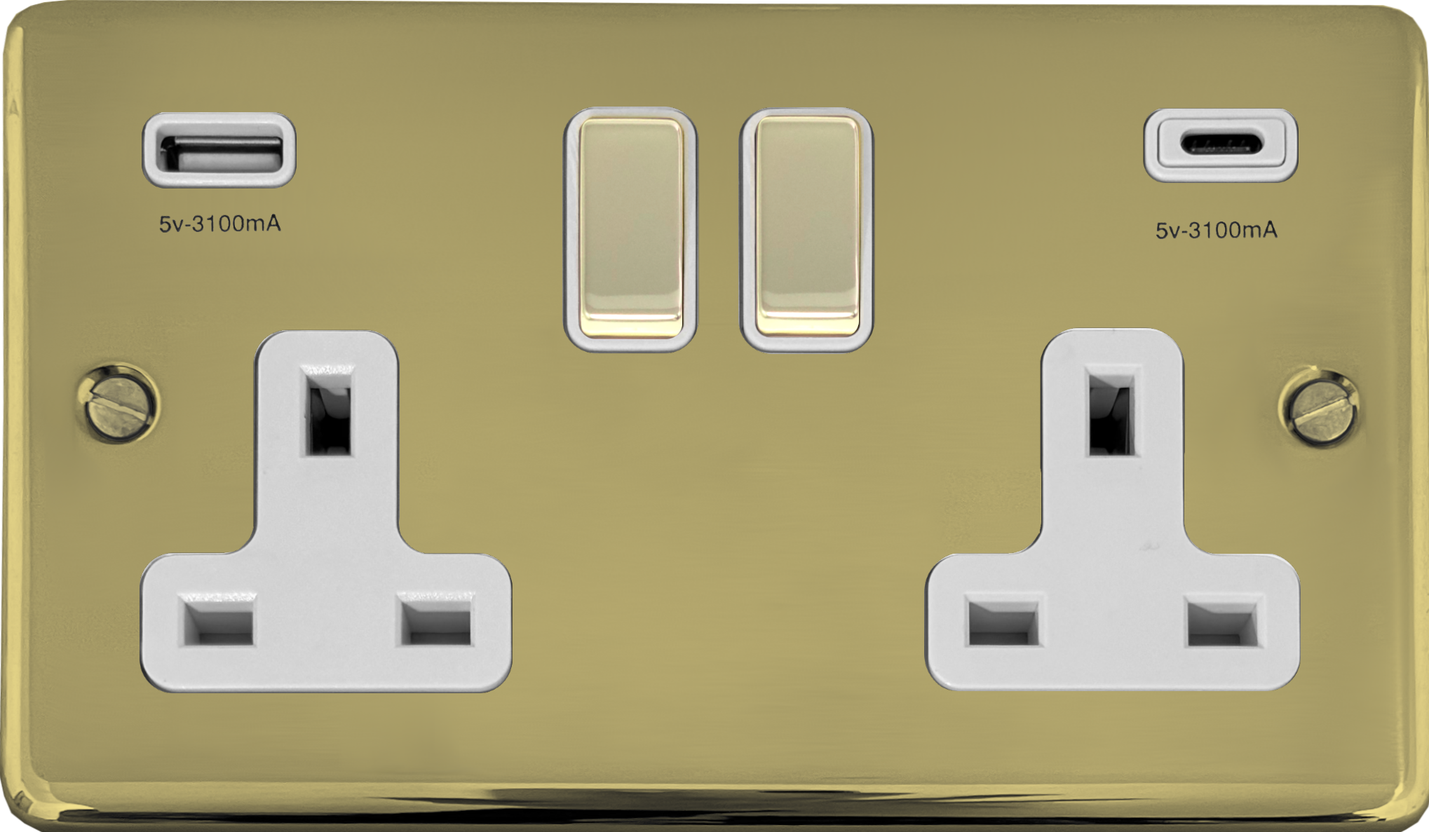 Contour Polished Brass Double Socket with USB (USB-A and USB-C/White Inserts Brass Switches) - CB2911