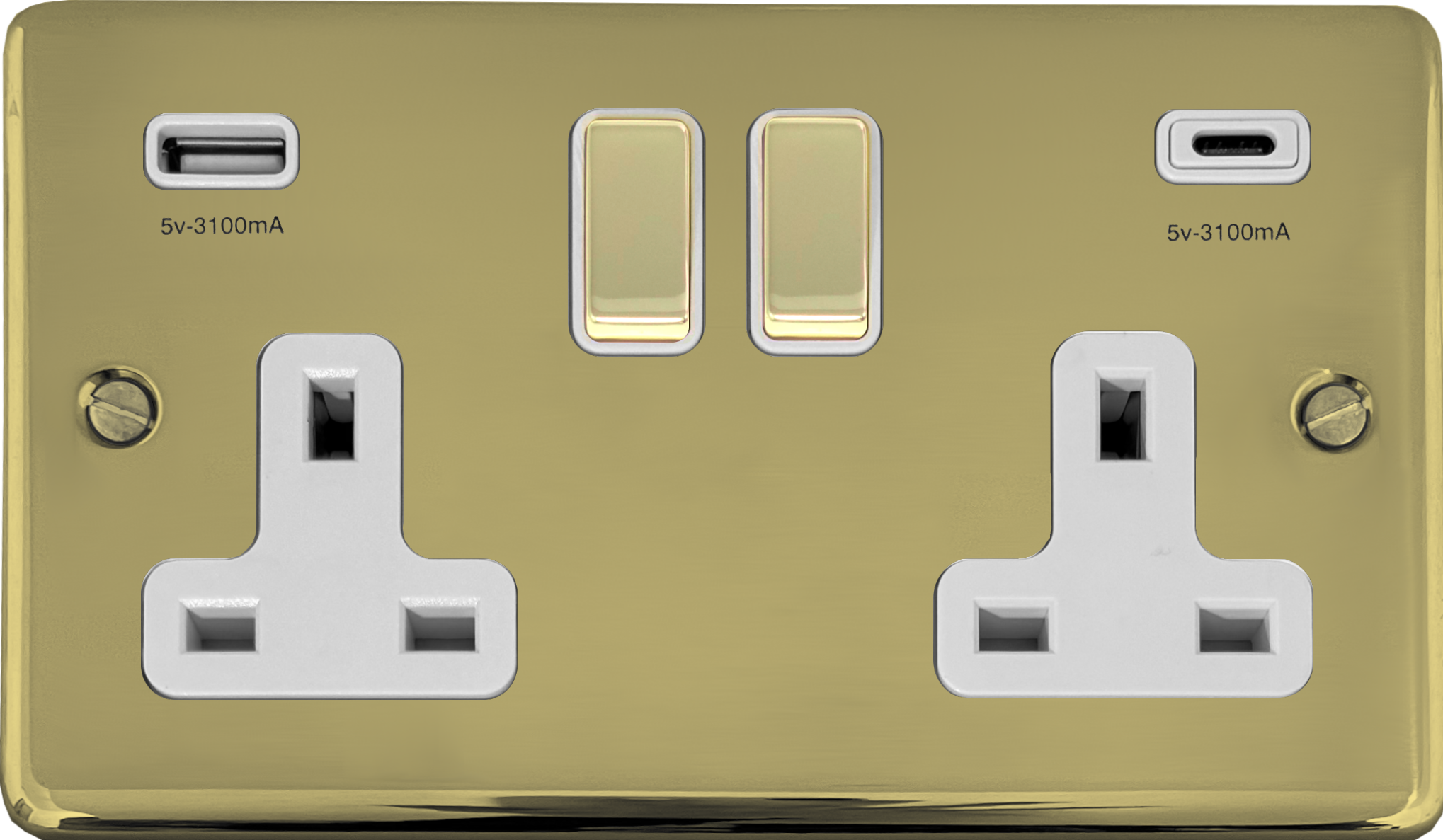Contour Polished Brass Double Socket with USB (USB-A and USB-C/White Inserts Brass Switches) CL.2911.B