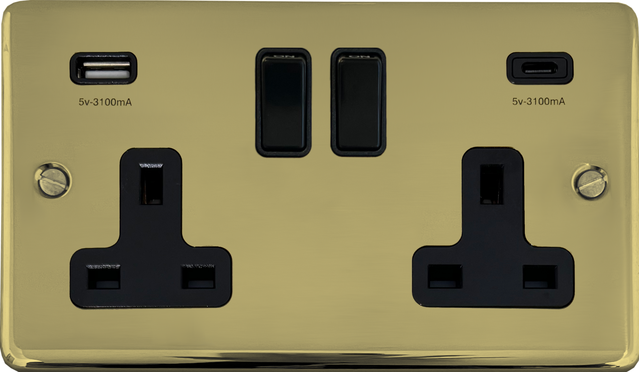 Contour Polished Brass Hand Waxed Double Socket with USB (USB-A and USB-C/Black Switches) CL.911B.HX