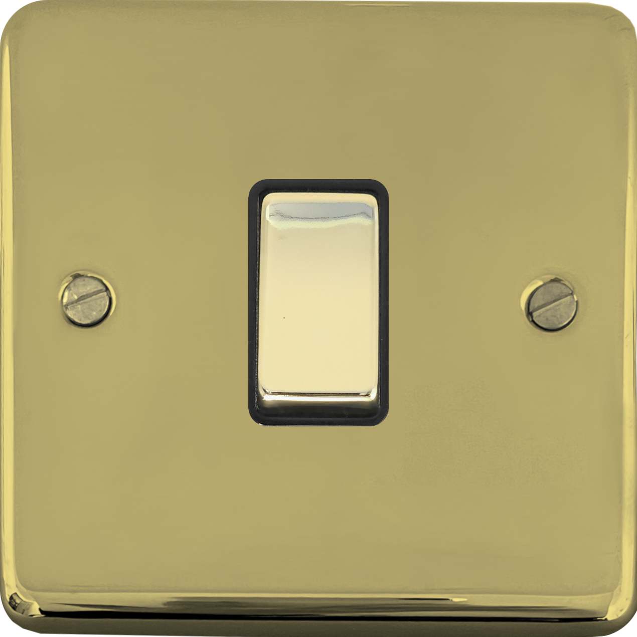 It is part of the complete range of Contour polished brass switches and sockets from G+H Electrical Accessories. The rocker switch is matching polished brass with a black plastic surround.