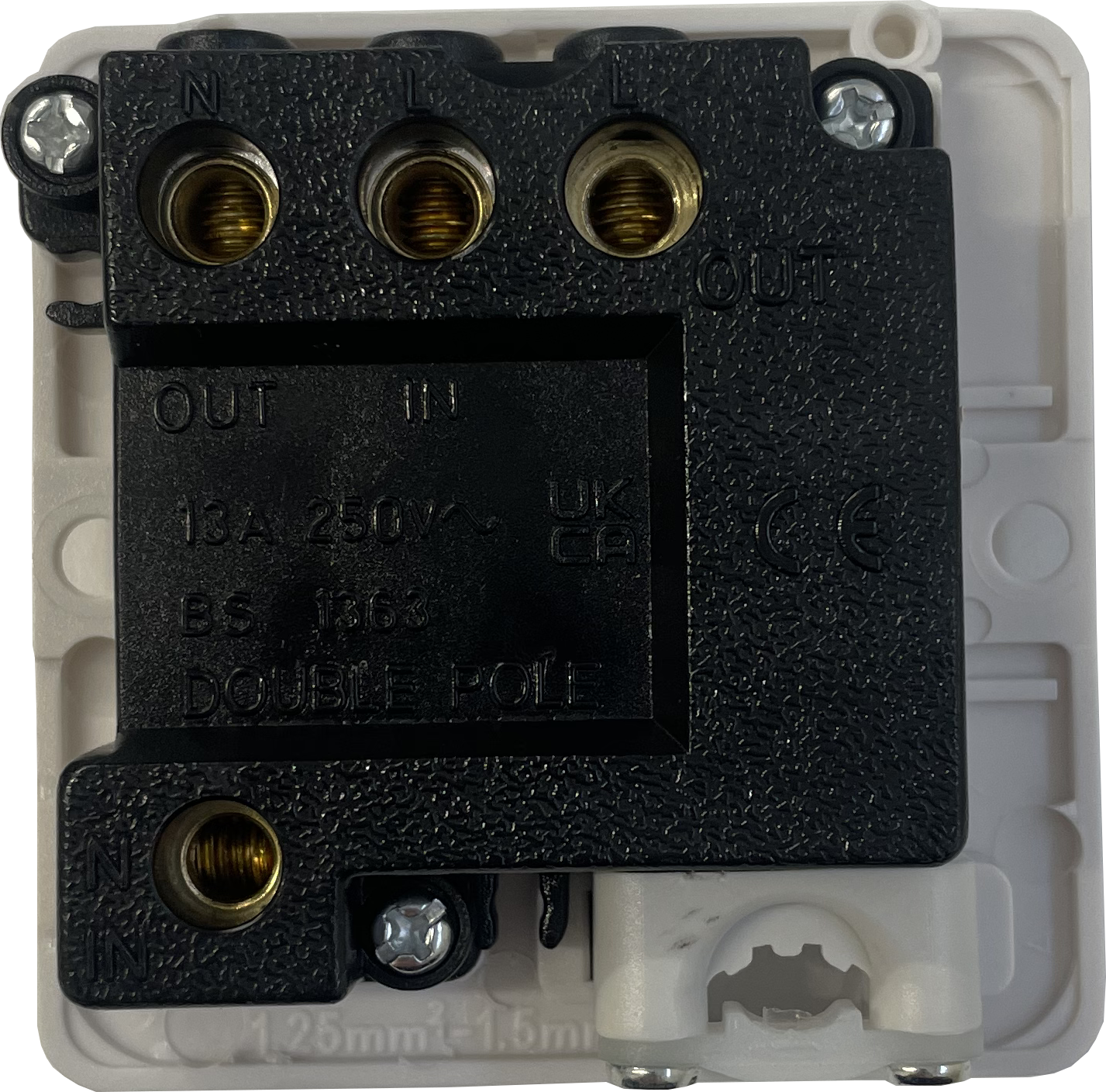 It has a white switch and inserts. The plate is made of polished brass. The plate is a 13 amp switched fused spur.
