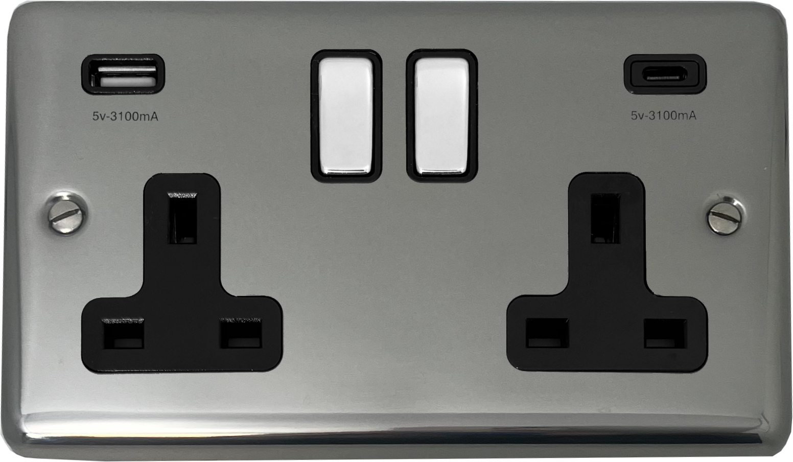 Contour Polished Steel Double Socket with USB (USB-A and USB-C/Black Inserts/Steel Switches) CL.3911.PS