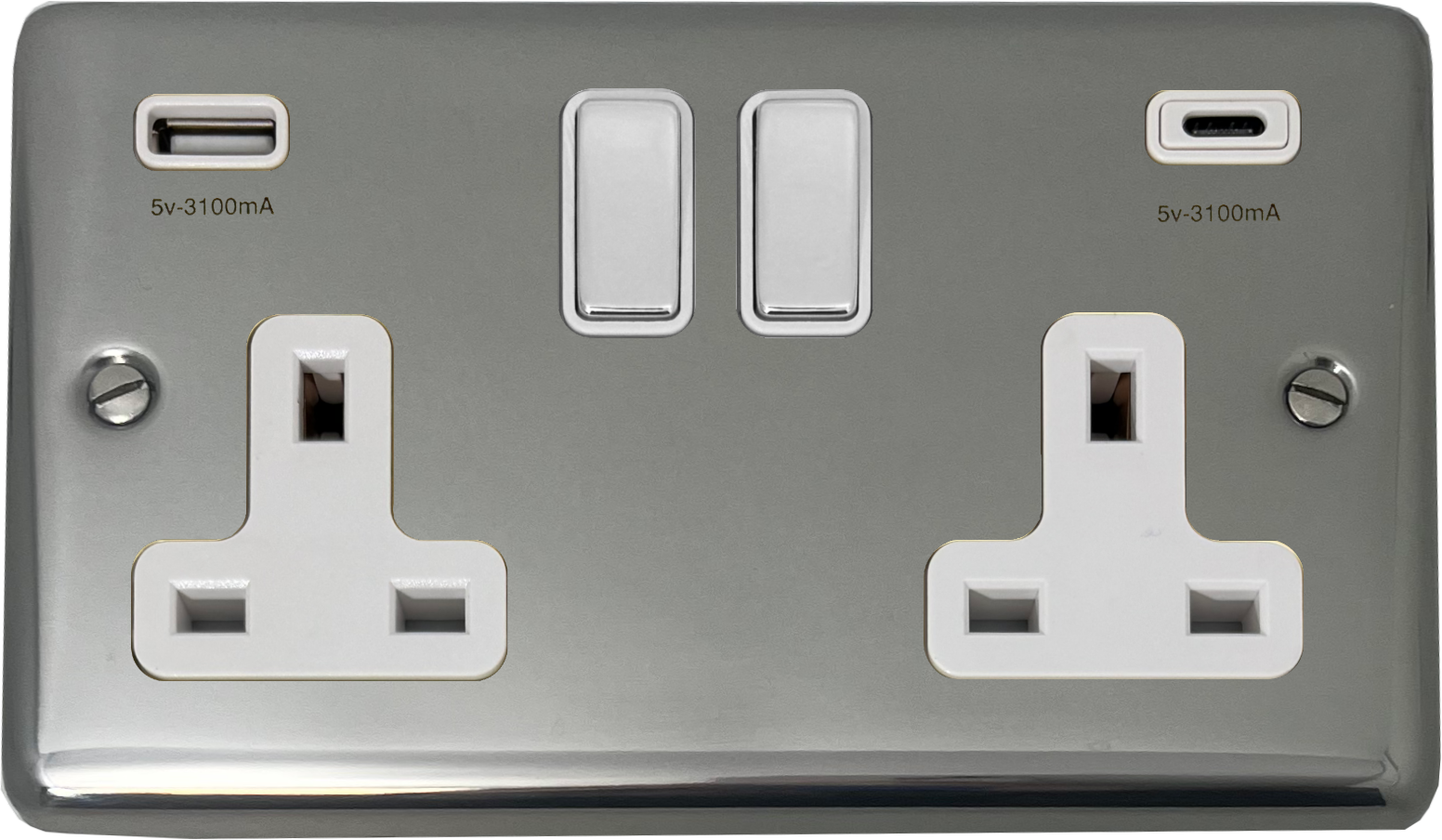 Contour Polished Steel Double Socket with USB (USB-A and USB-C/White Inserts/Steel Switches) - CPS2911