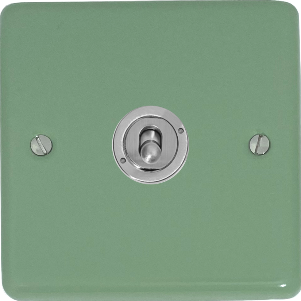 1 Gang Toggle switch from our Contour range. Sage Green plate colour with a brushed steel toggle.