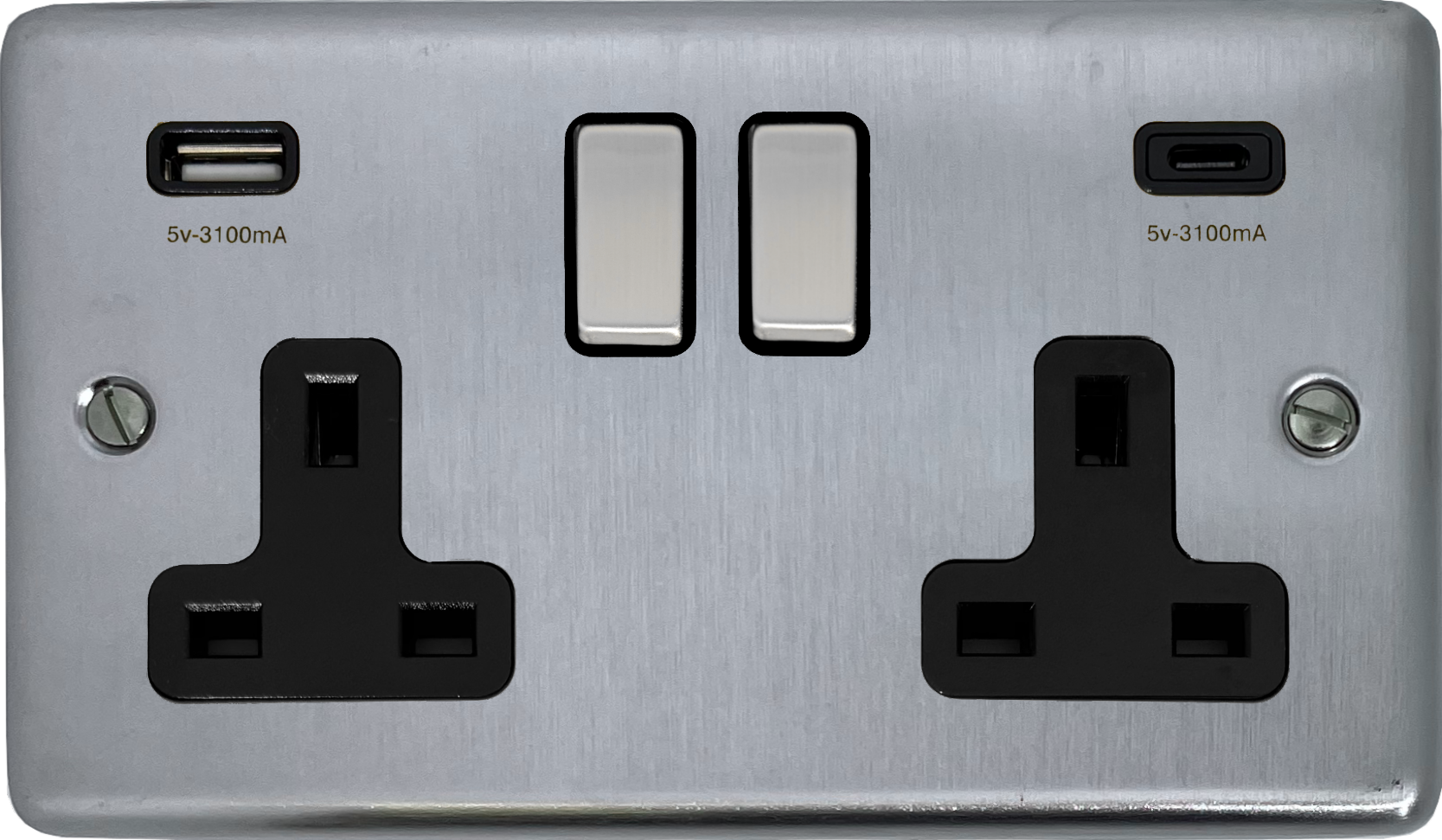 Contour Satin Chrome Double Socket with USB (USB-A and USB-C/Black Insert/Matching Switch) CL.3911.SC