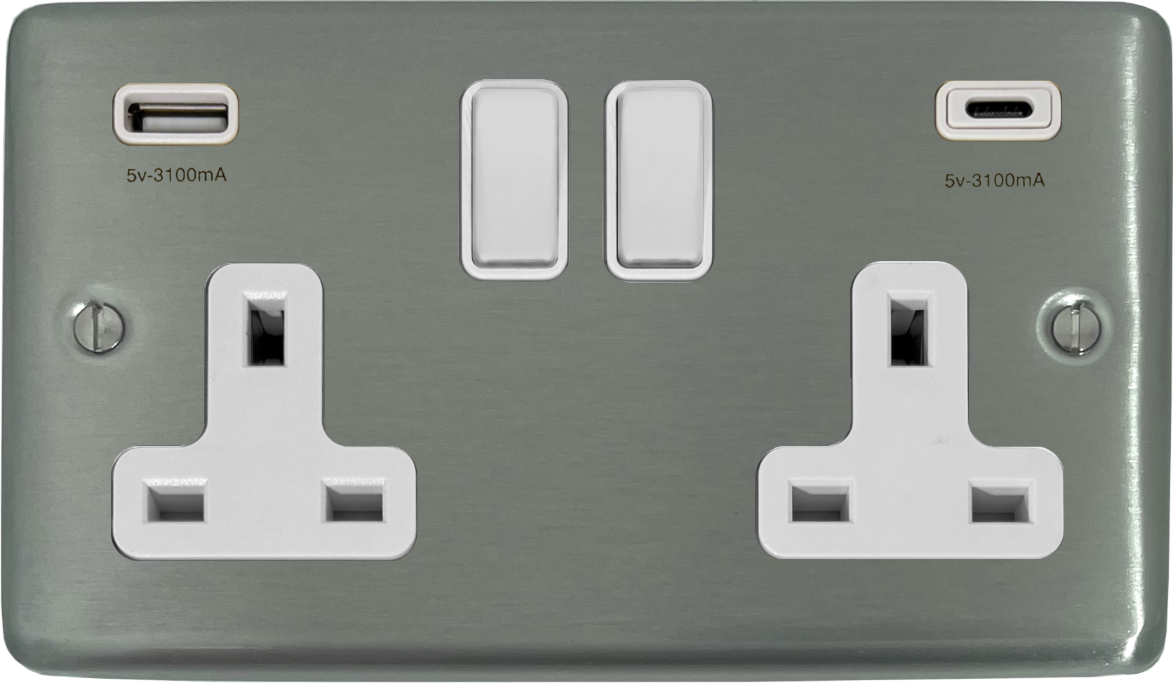Contour Stainless Steel Double Socket with USB (2 Gang/USB-A and USB-C/White Switches) CL.911W.SS