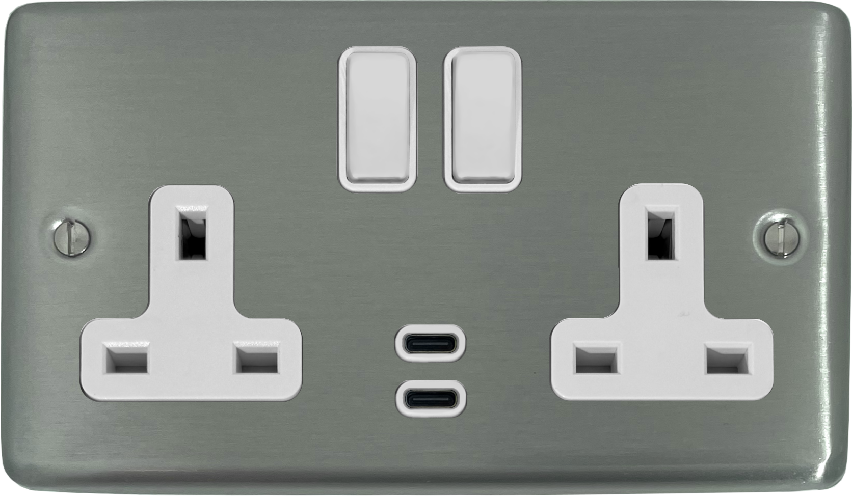 Contour Stainless Steel Double Socket with USB (2 Gang/USB-A and USB-C/White Switches) CL.913W.SS