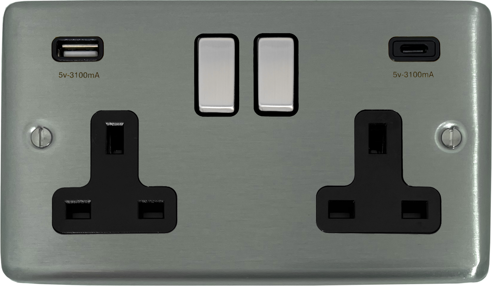 Contour Stainless Steel Double Socket with USB (USB-A and USB-C/Black Inserts/Steel Switches) CL.3911.SS