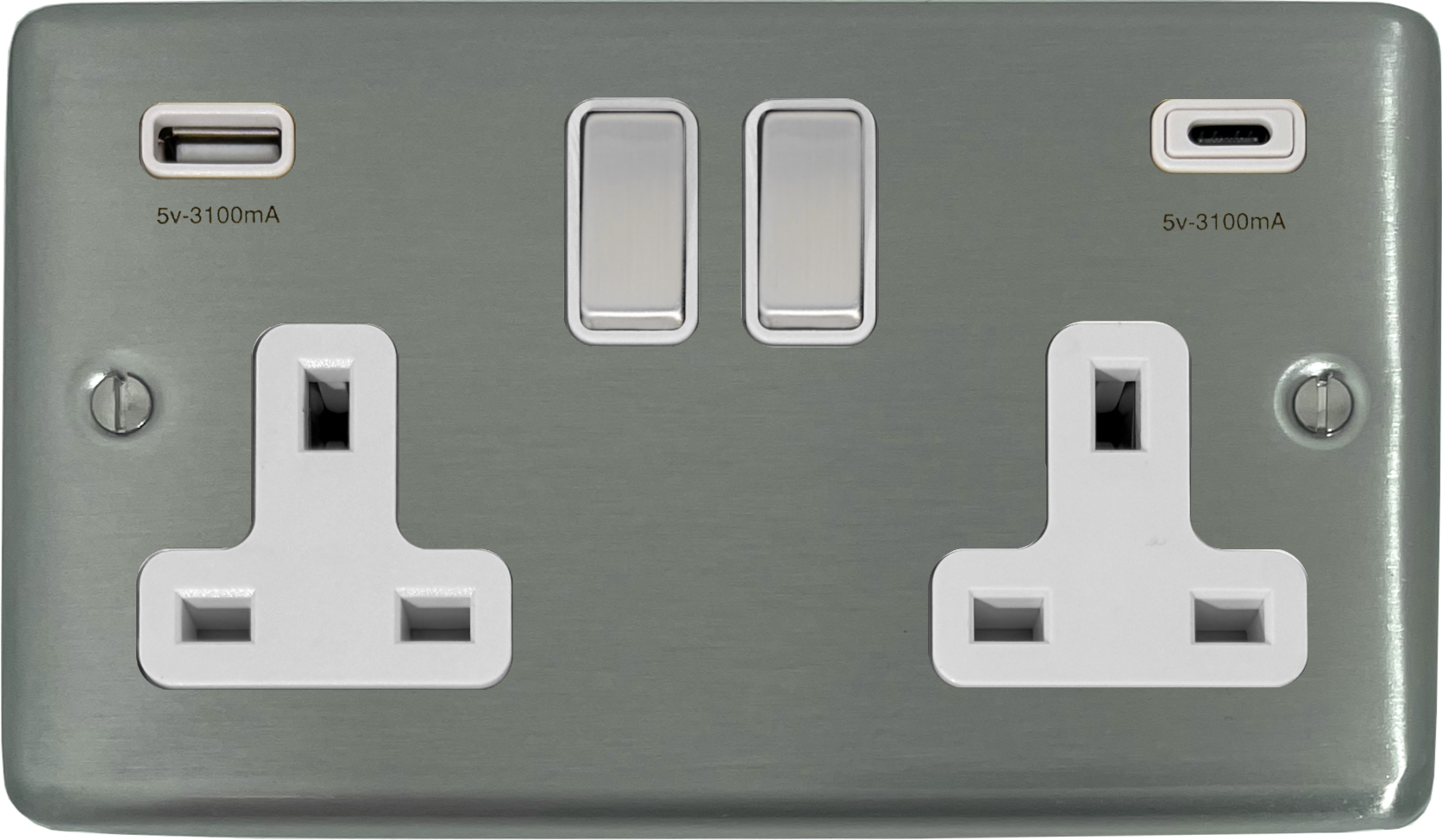 Contour Stainless Steel Double Socket with USB (USB-A and USB-C/White Inserts/Steel Switches) CL.2911.SS