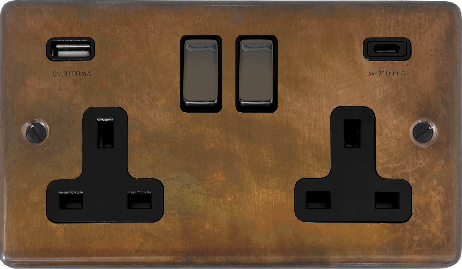 Contour Tarnished Copper Double Socket with USB (USB-A and USB-C/Black Nickel Switches) CL.3911.TC