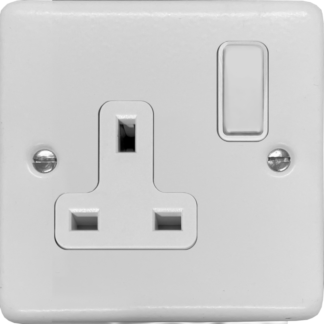 This is a 1 Gang 13A Switched Socket with White inserts and a White switch on a contour white plate.