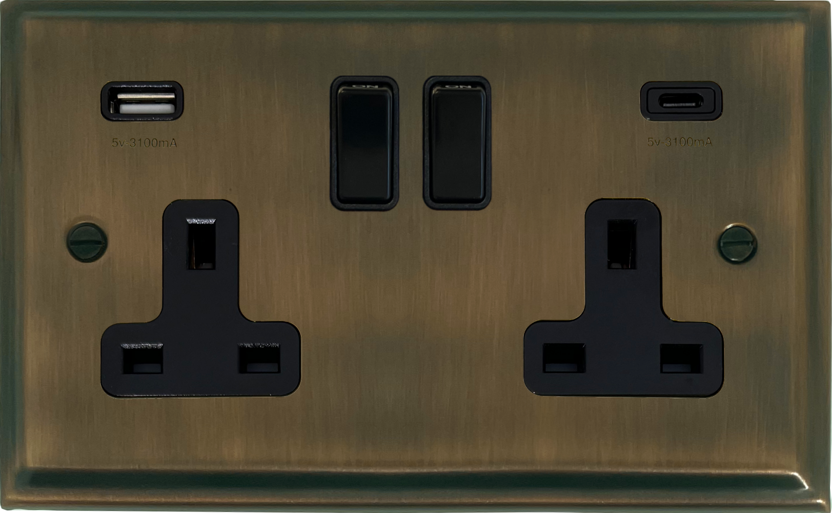 Deco Antique Brass Double Socket (2 Gang/USB-A and USB-C/Black Switches) PE.911B.AB