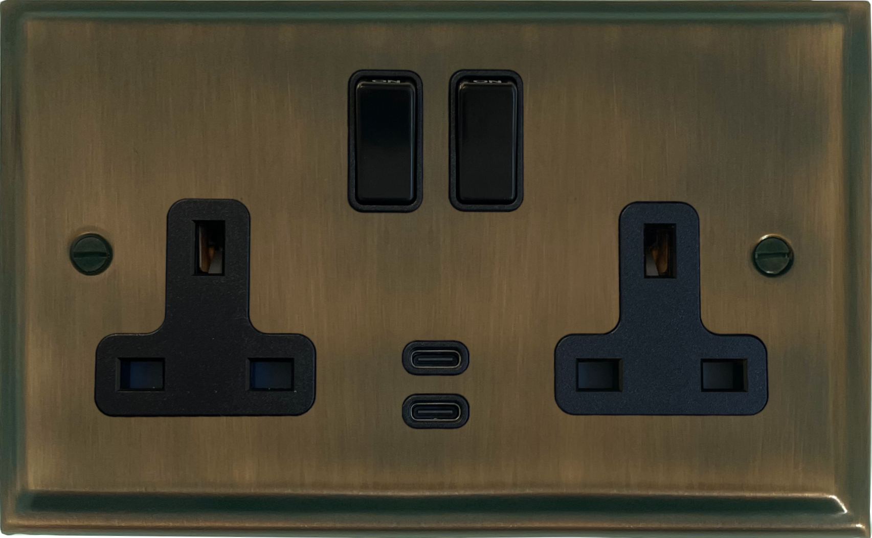 Deco Antique Brass Double Socket (2 Gang/USB-C/Black Switches) PE.913B.AB