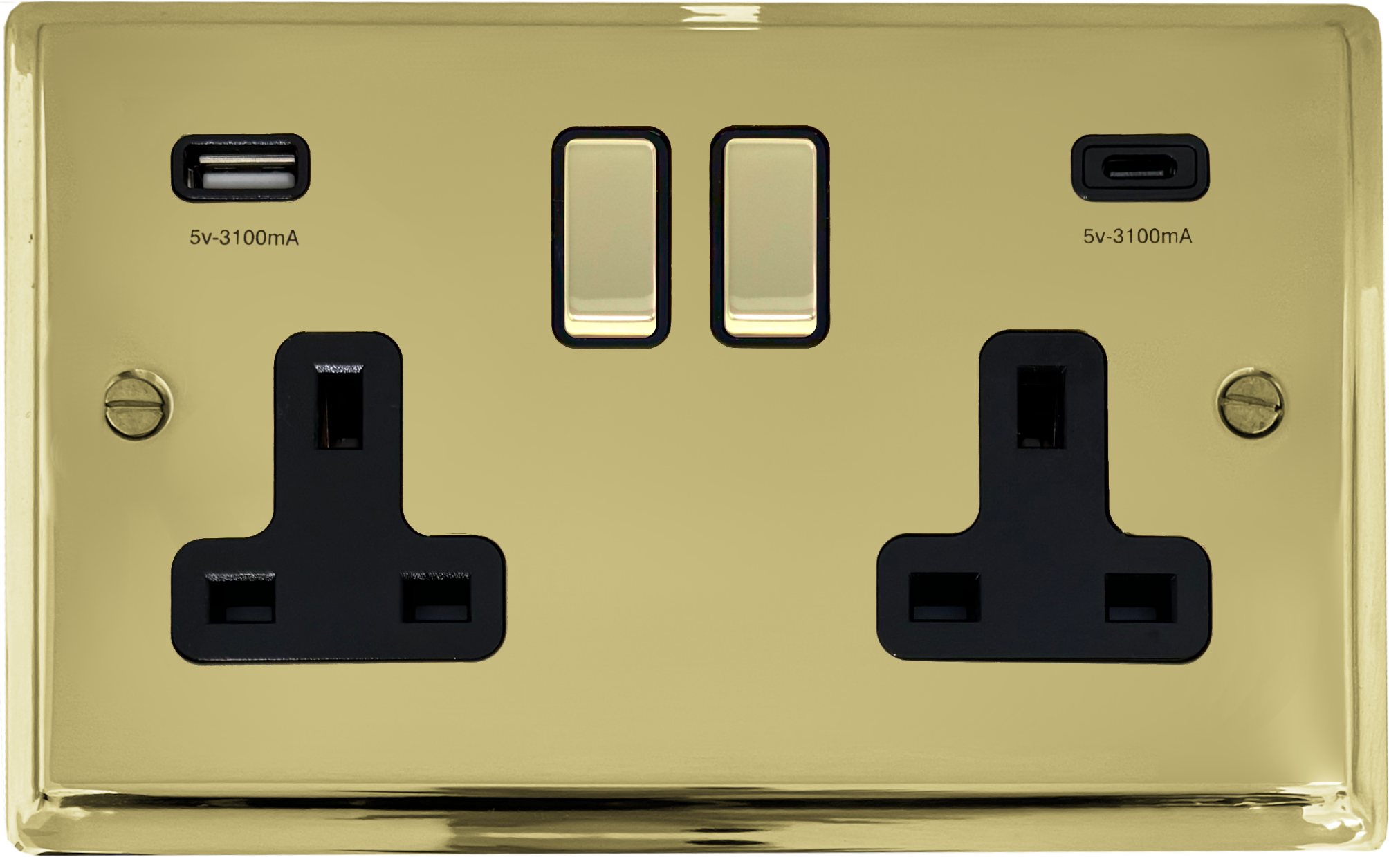 Deco Polished Brass Double Socket with USB (USB-A and USB-C/Black Inserts Brass Switches) PE.3911.B