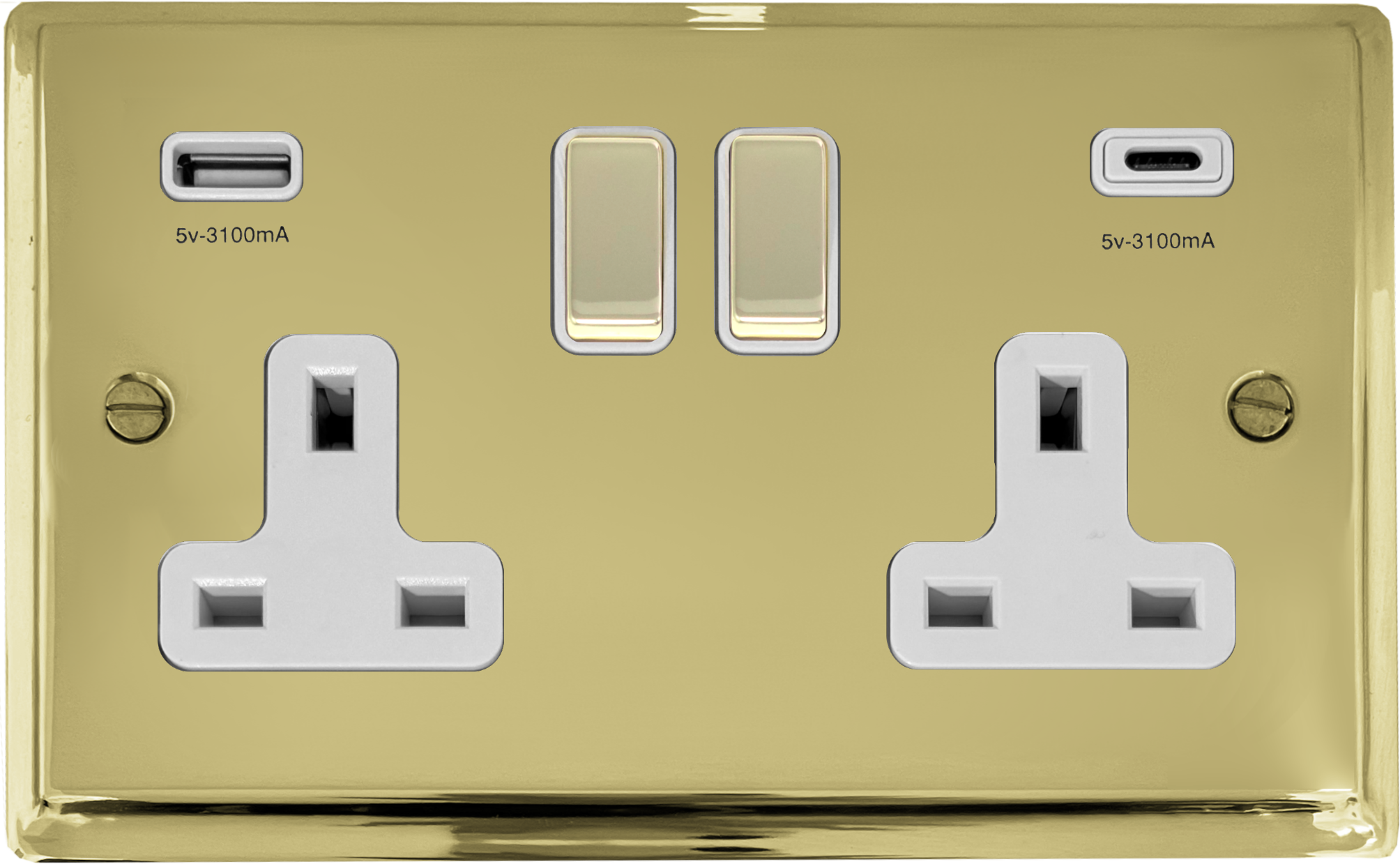 Deco Polished Brass Double Socket with USB (USB-A and USB-C/White Inserts Brass Switches) - DB2911