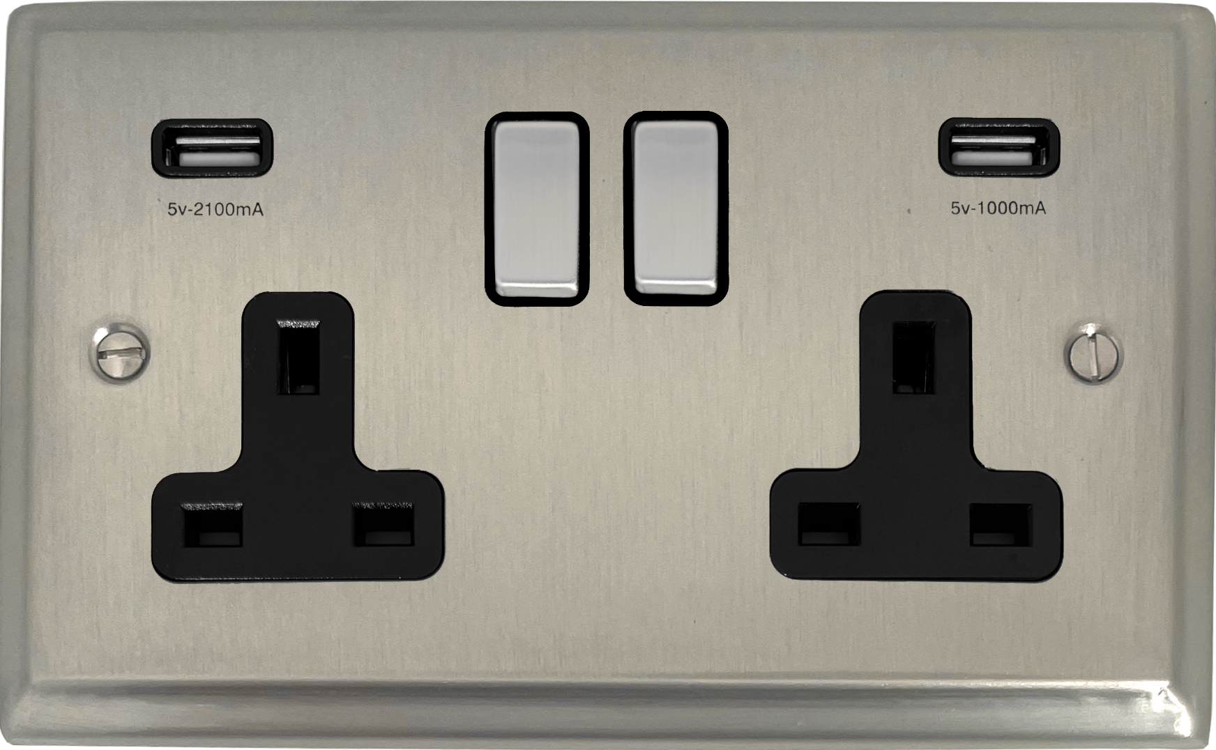 Deco Satin Nickel Double Socket with USB (Black Insert/Matching Switch) PE.3910.SN