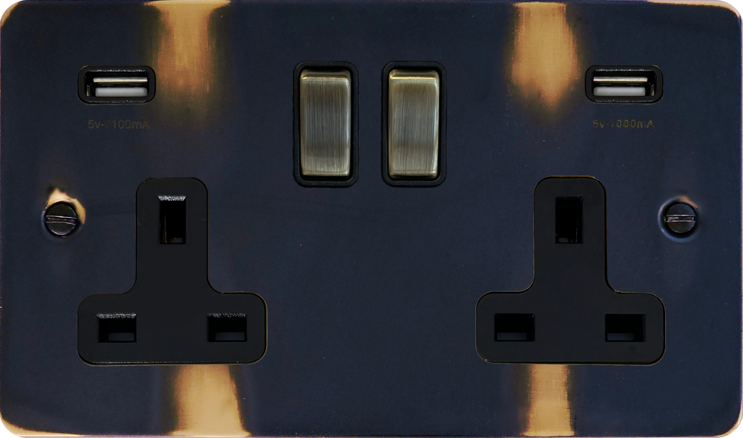 Flat Aged Brass Double Socket with USB (Black insert/Antique Brass Switches) - FAN3910