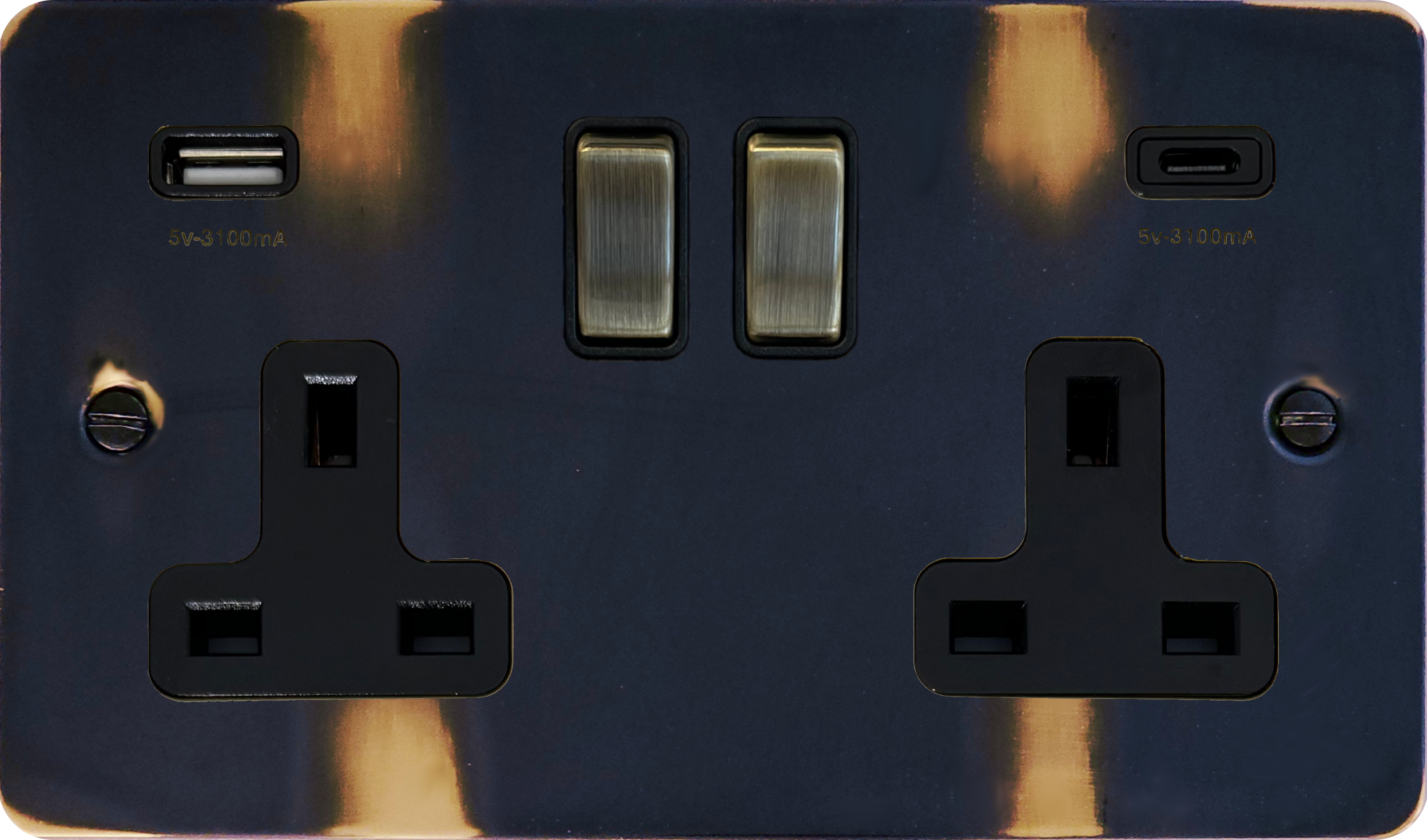 Flat Aged Brass Double Socket with USB (USB-A and USB-C/Antique Brass Switches) FL.3911.AN