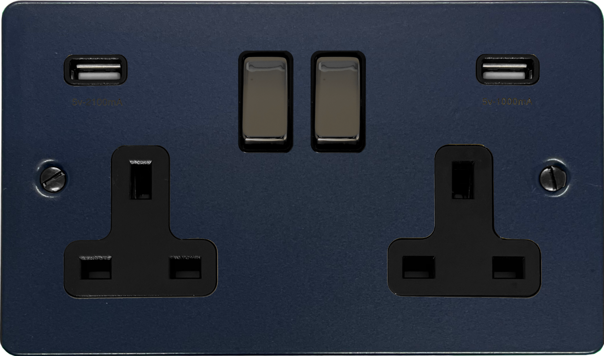 Flat Blue Double Socket with USB (Black Insert/Black Nickel Switches) - FRB3910-BN