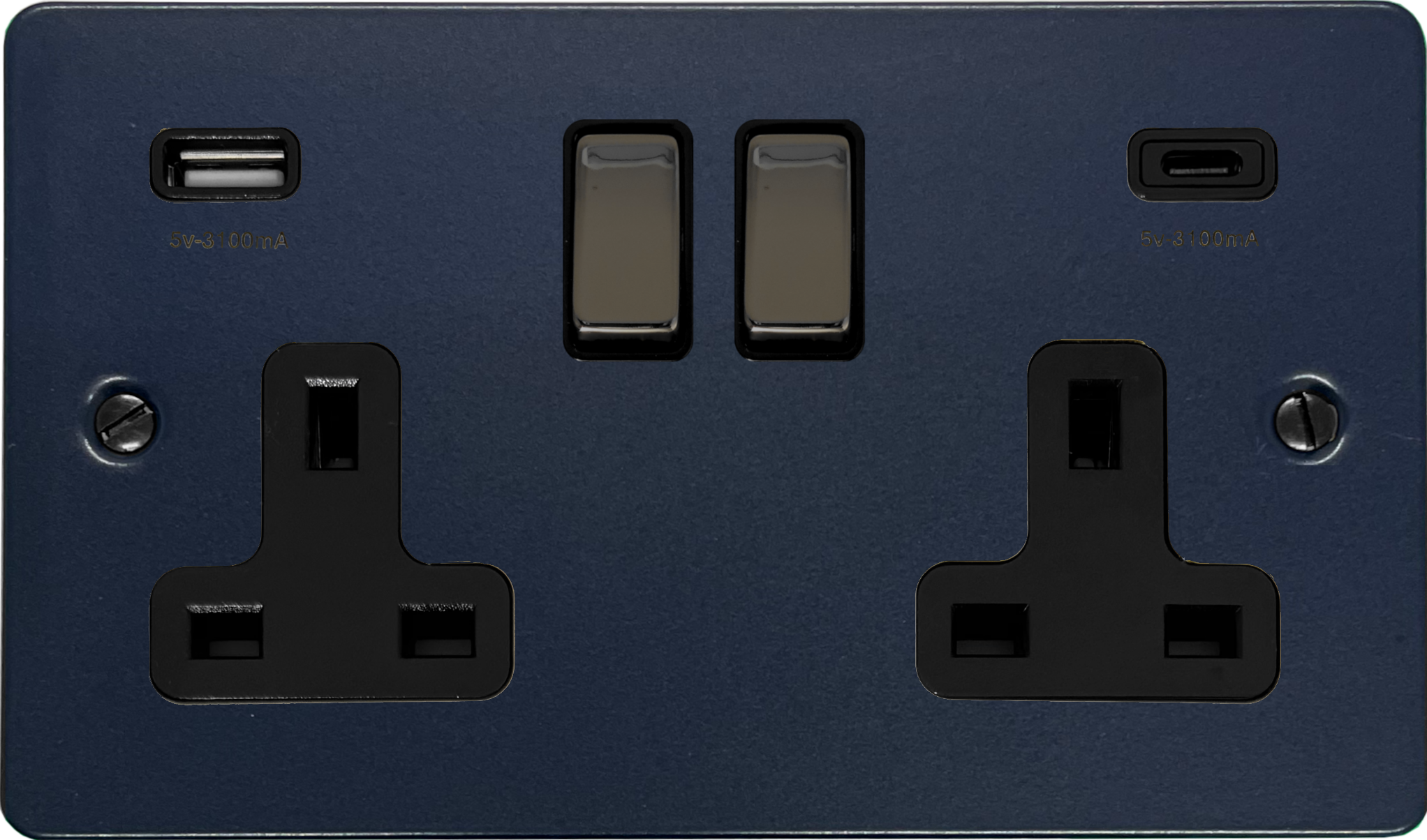 Flat Blue Double Socket with USB (USB-A and USB-C/Black Nickel Switches) - FRB3911-BN