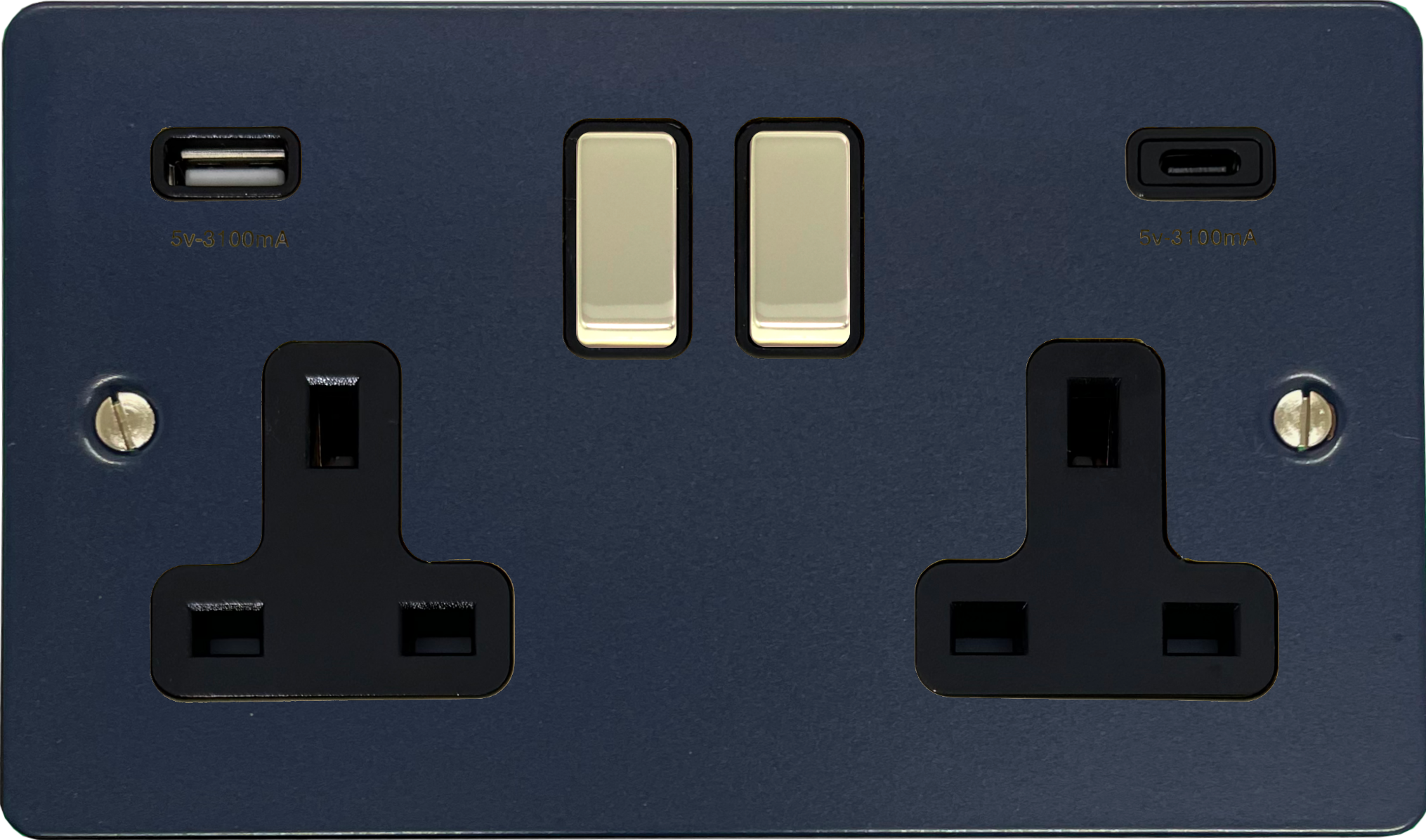 Flat Blue Double Socket with USB (USB-A and USB-C/Polished Brass Switches) - FRB3911-PB