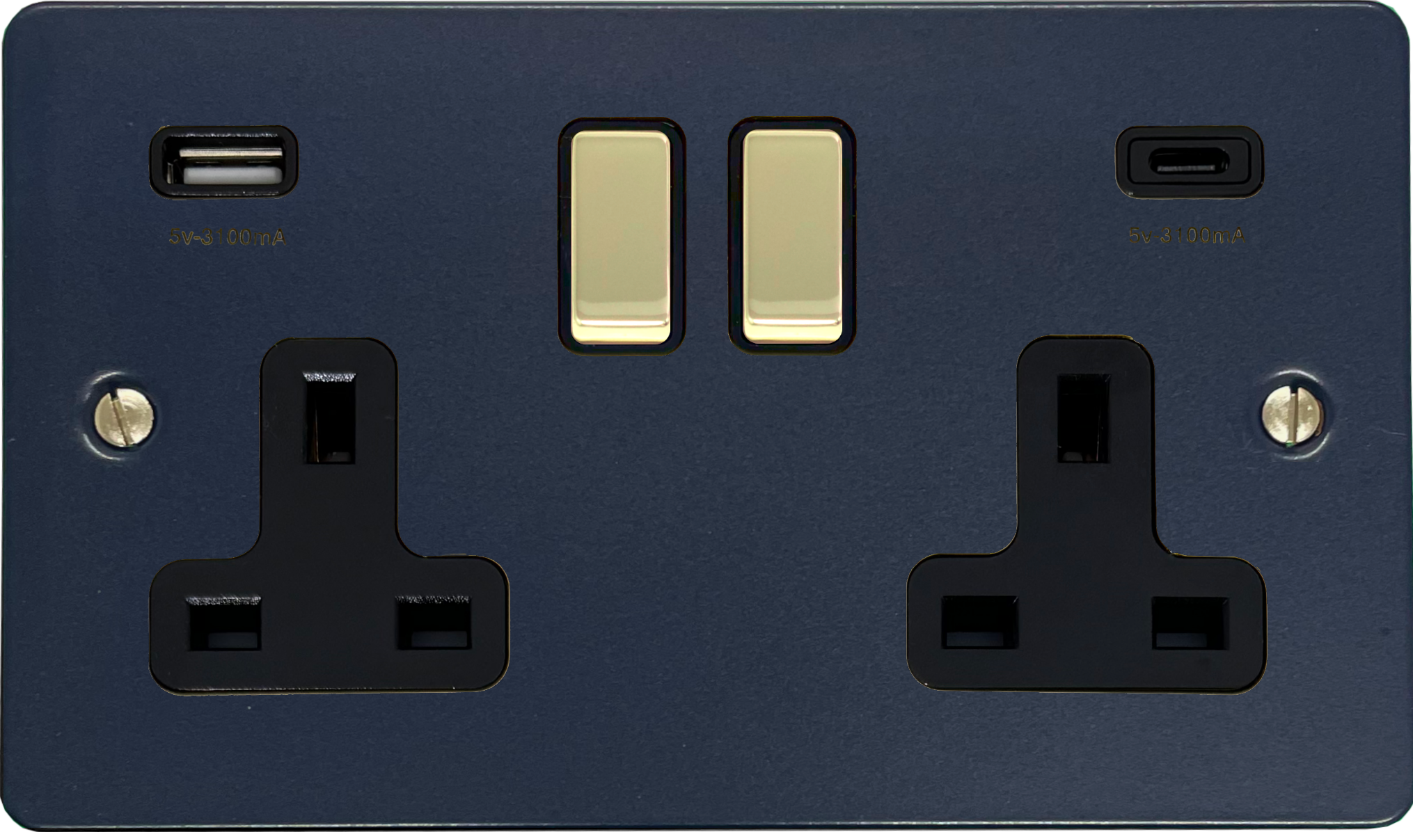 Flat Blue Double Socket with USB (USB-A and USB-C/Polished Brass Switches) FL.3911PB.RB