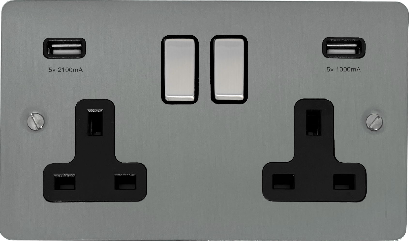 Flat Brushed Steel Double Socket with USB (Black Insert/Satin Chrome Switches) FL.3910.SS