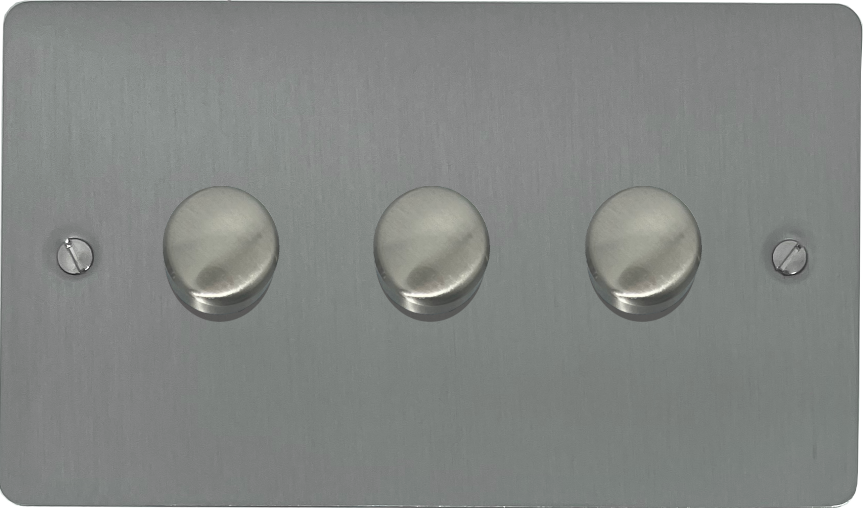 This is a three gang LED dimmer fixed to a flat brushed steel dimmer plate.