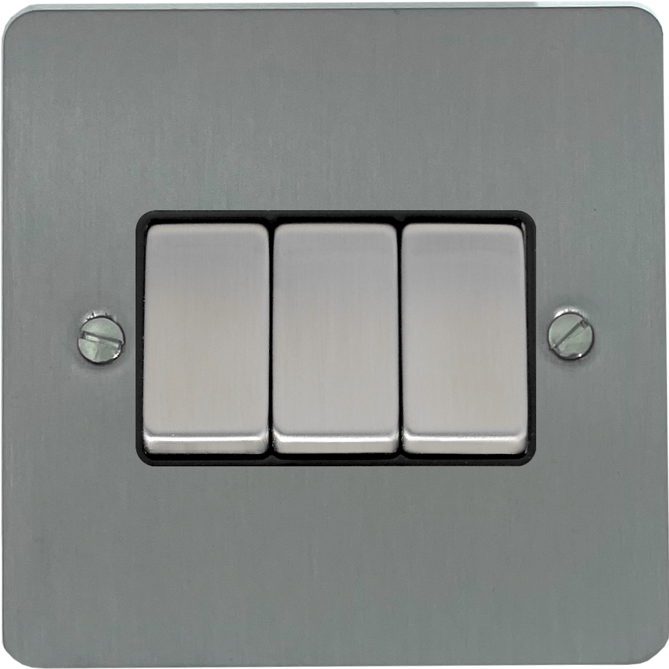 Flat Brushed Steel Light Switch (3 Gang/Black Insert/Satin Chrome Switches) FL.303.SS