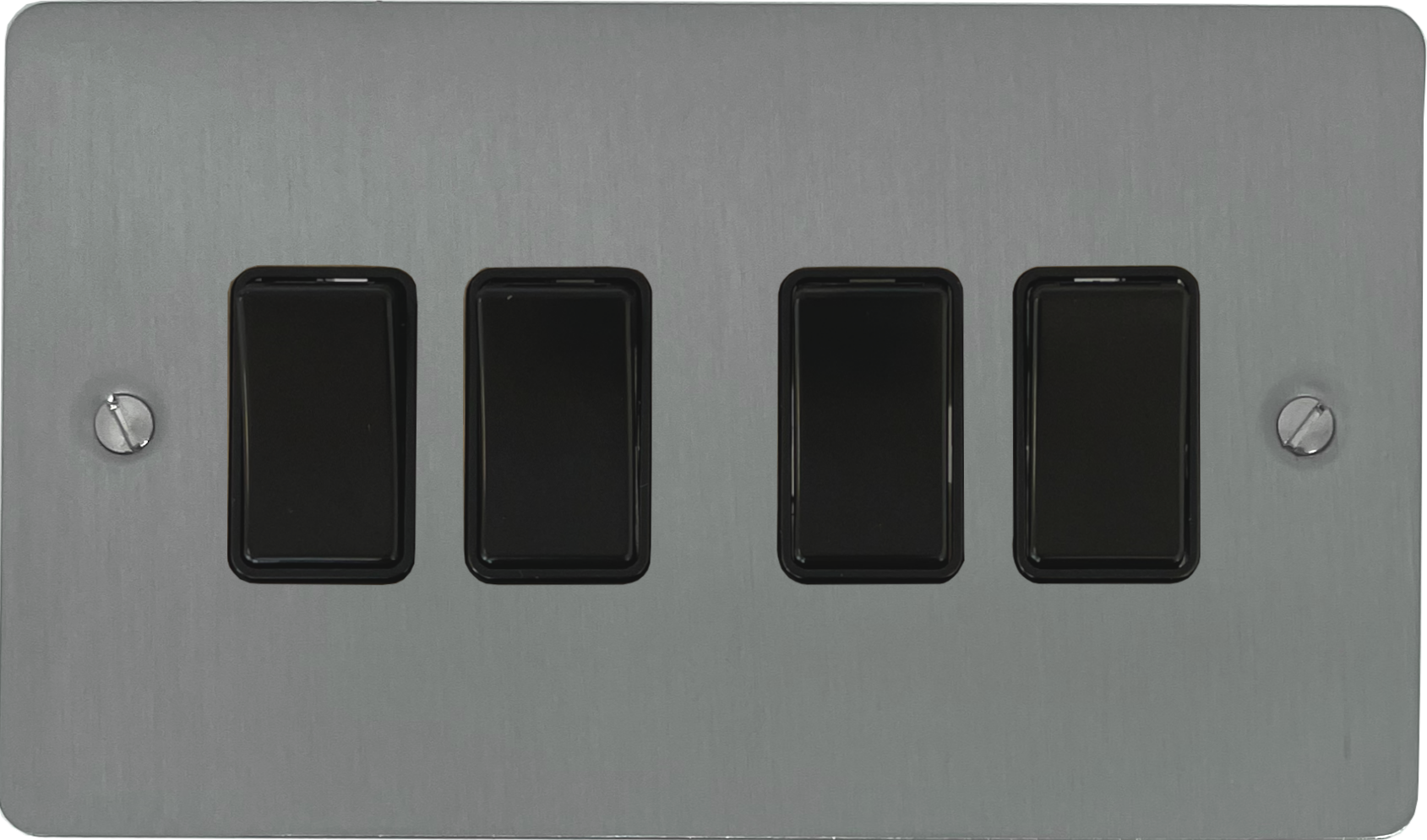 Flat Brushed Steel Light Switch (4 Gang/Black Switches) FL.4B.SS