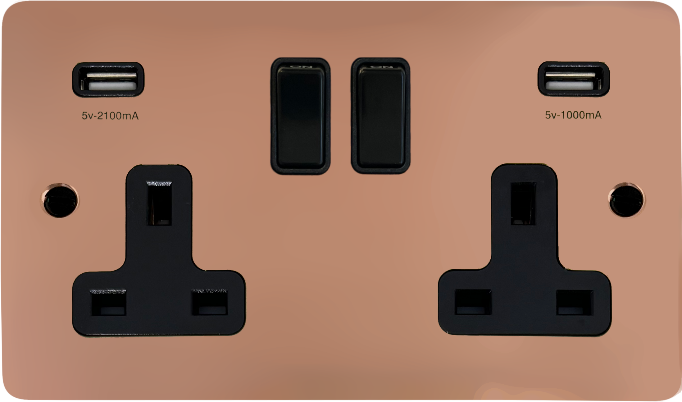 Flat Copper Hand Waxed Double Socket with USB (Black Switch) - FBCHX910B