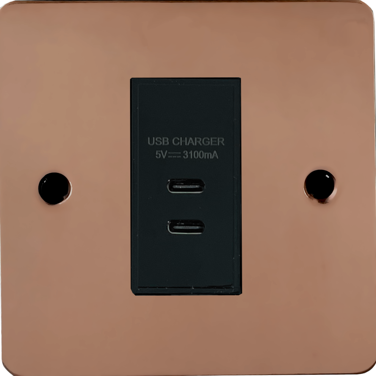 Flat Copper Hand Waxed USB Charger (2x USB-C) (1 Gang/Black Insert) FL.42B.BCHX