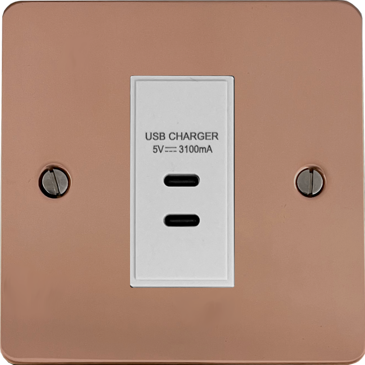 Flat Copper Hand Waxed USB Charger (2x USB-C) (1 Gang/White Insert) FL.42W.BCHX
