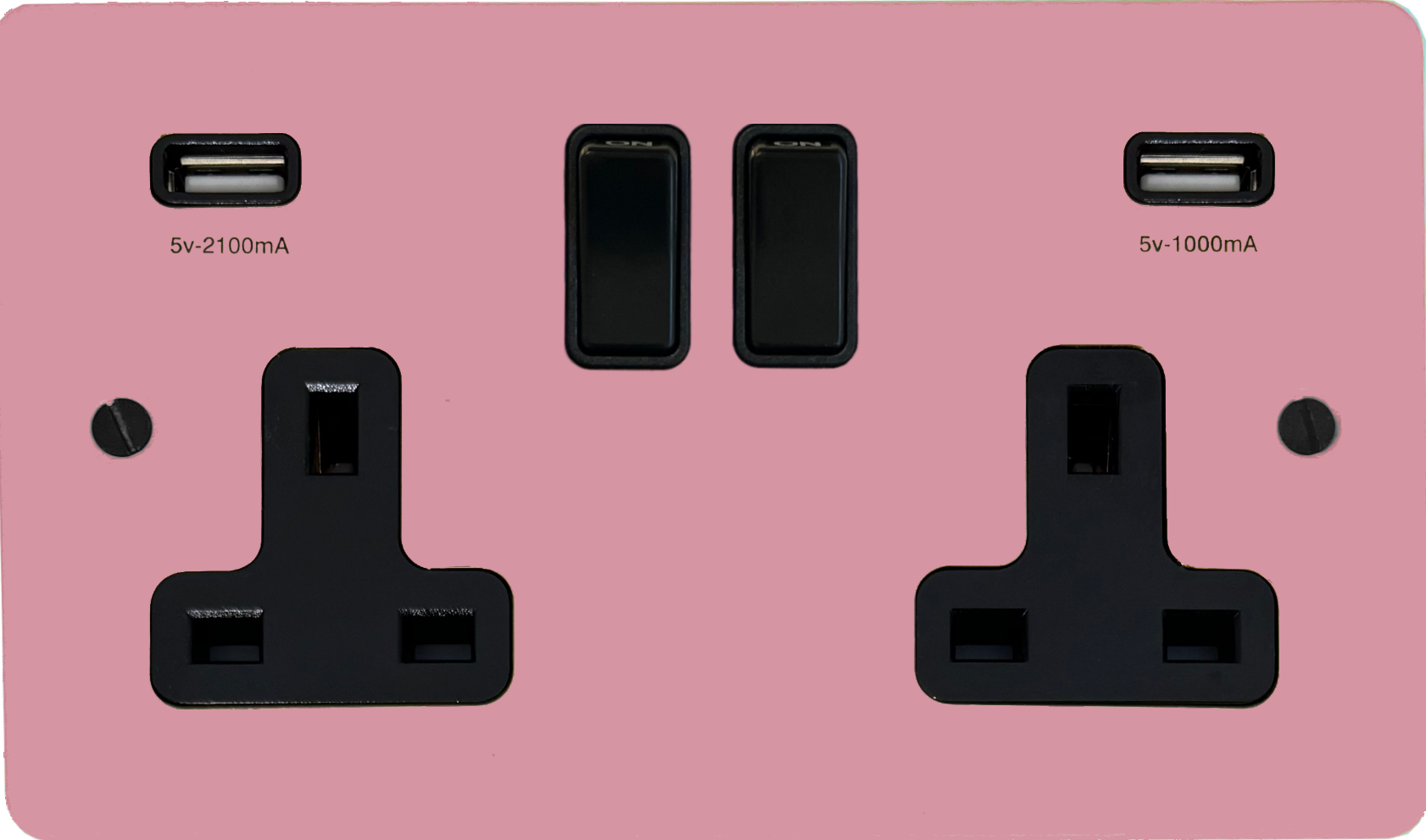 Flat Gloss Pink Double Socket with USB (Black Switches) - FGP910B