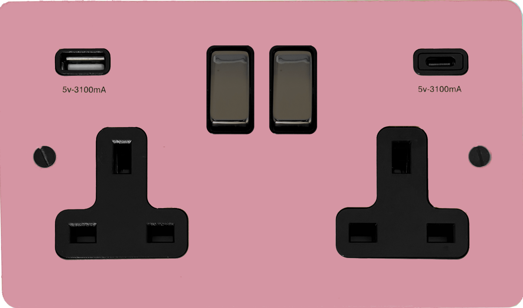 Flat Gloss Pink Double Socket with USB (USB-A and USB-C/Black Nickel Switches) - FGP3911-BN