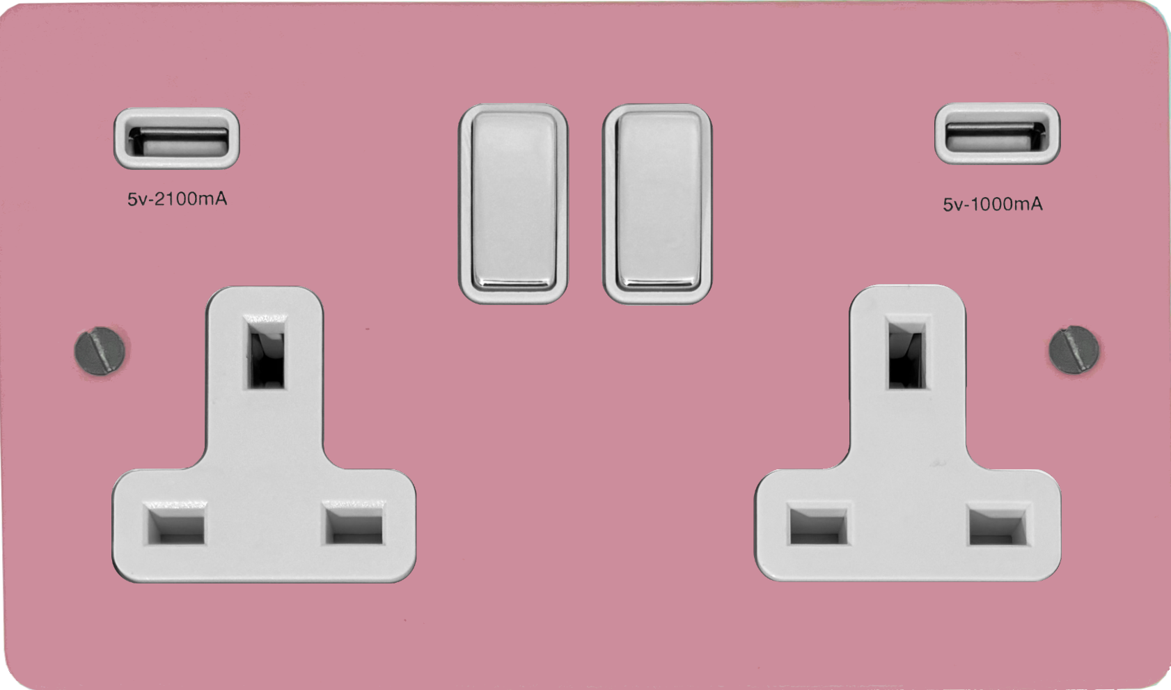 Flat Gloss Pink Double Socket with USB (White Insert/Polished Chrome Switches) - FGP2910-PC