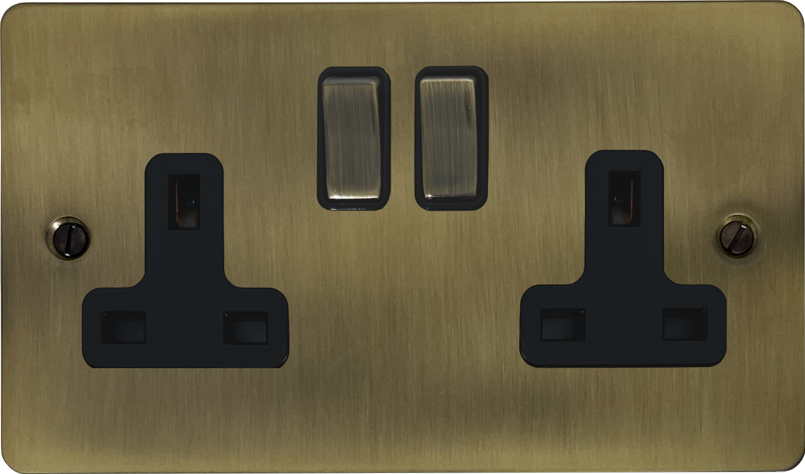 A Flat brass plate finished in a light antique brass with antique brass switches and black insert.